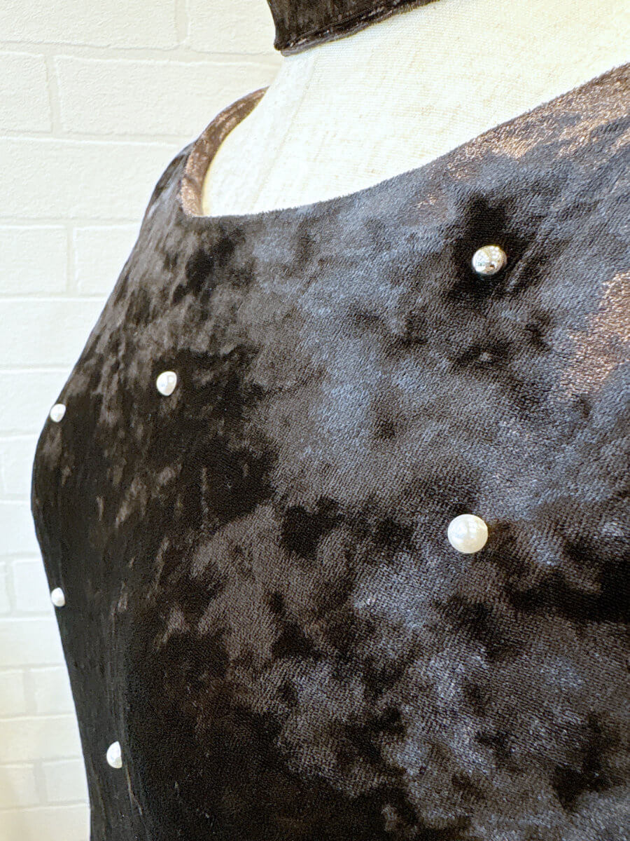 ◇商品について:ベロア独特の柔らかさと滑らかさのあるドレスです。パールとシルバーが絶妙に散りばめられ上品な華やかさを演出。肌に沿うようなシルエットでラインをひろい過ぎずに重厚感のあるデザインです。程よい袖のドレープはベロアで落ち感があるので肩幅が気になる方も着やすいドレスです。