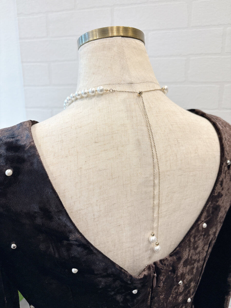 パールネックレス合わせもとてもよく合うのでチョーカーが苦手な方はネックレス合わせがおすすめです。