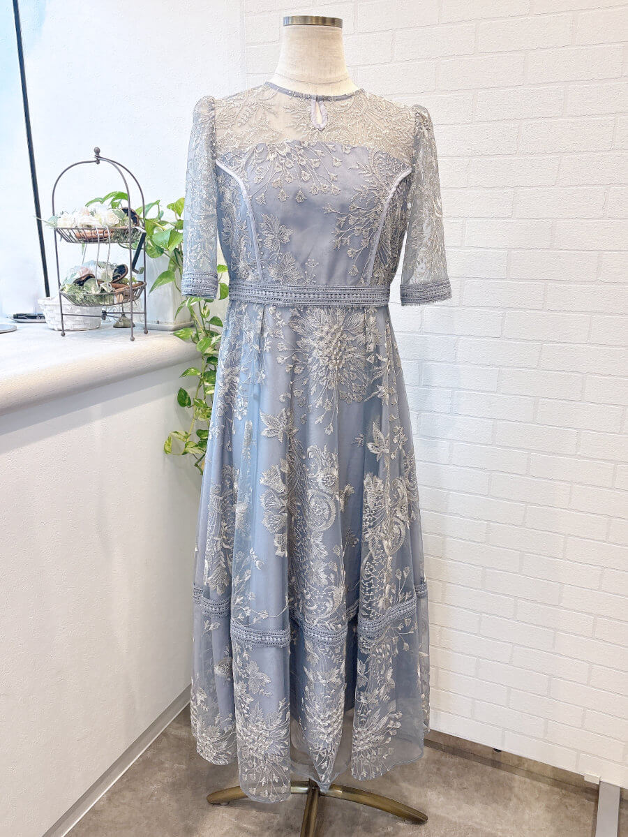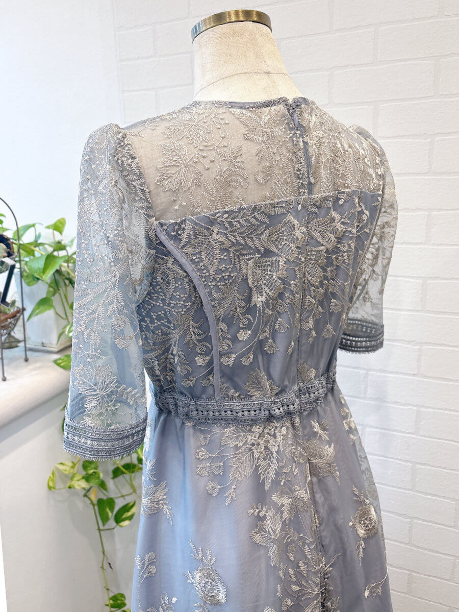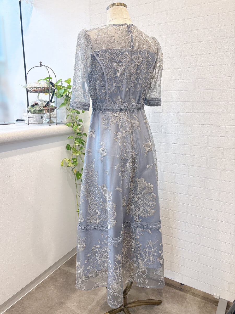 ◇商品について:ふんわりエアリーなシルエットのドレス。ブルー地にベージュゴールド系の繊細な刺繡が華やか。