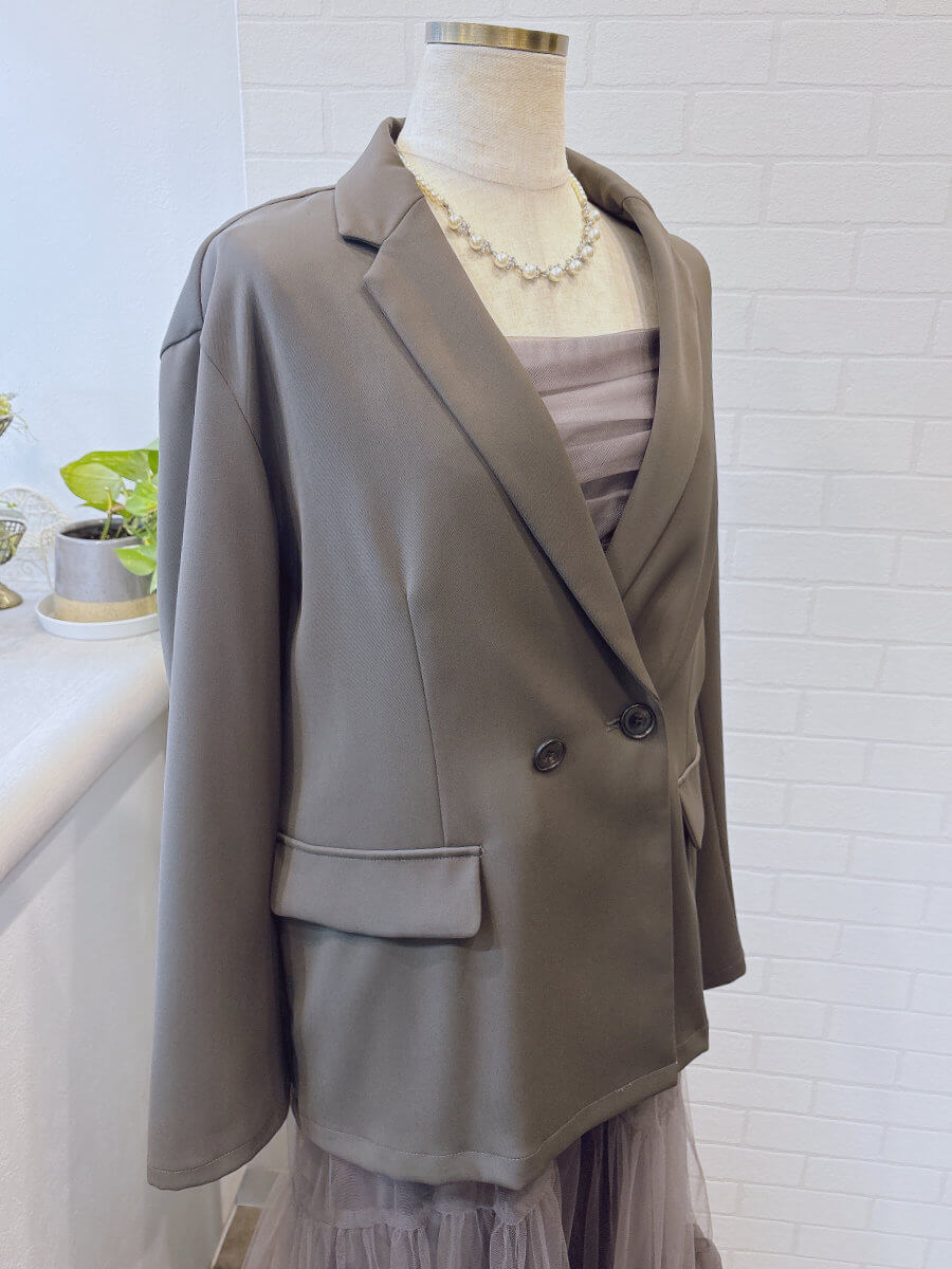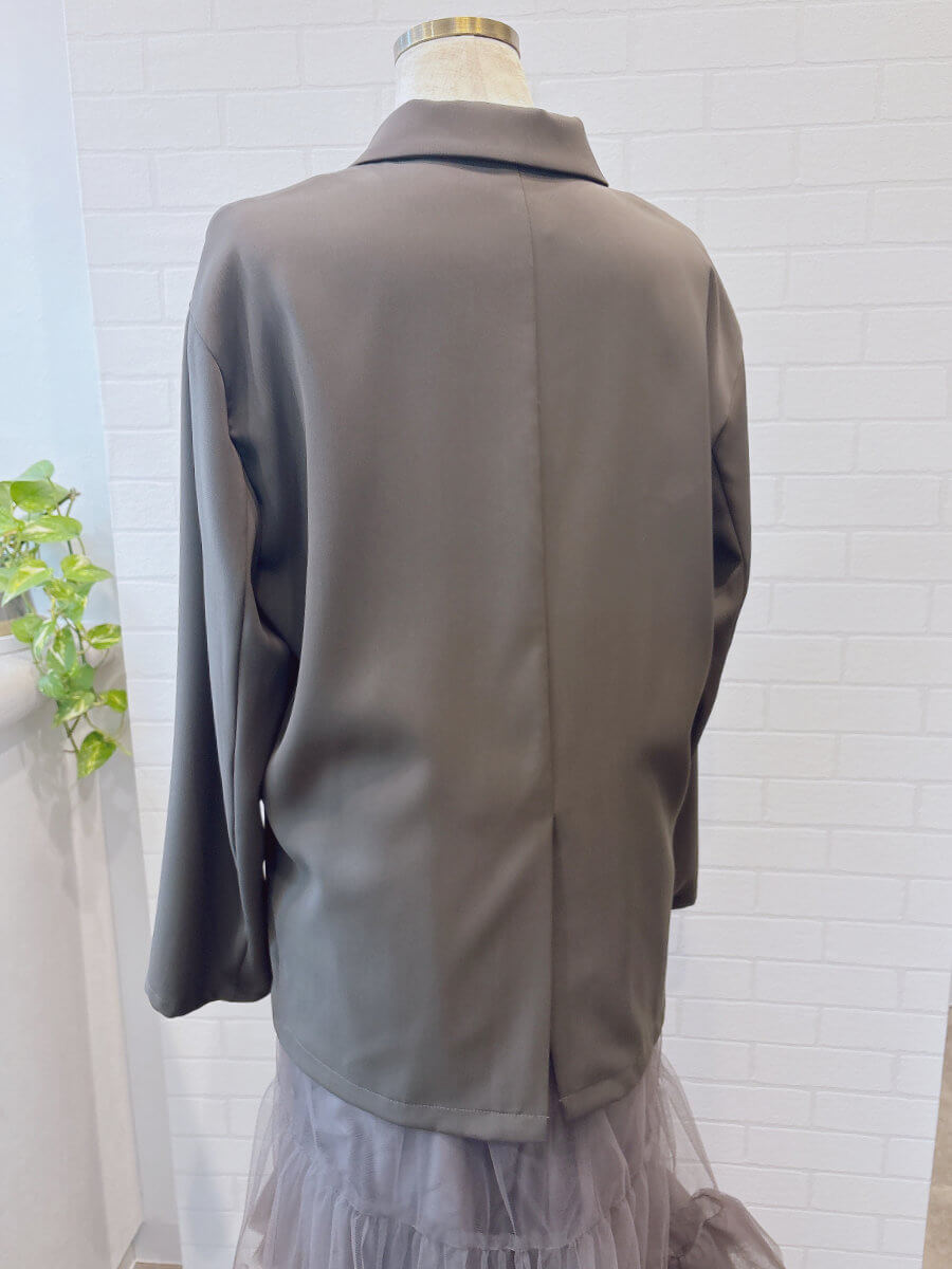 ジャケットは軽めのお素材でオーバーサイズ。ゆるっと今っぽく着こなせます。裏地はなくさらっと着れるので真夏以外は着用できます。ジャケットのポケットはフェイクです。