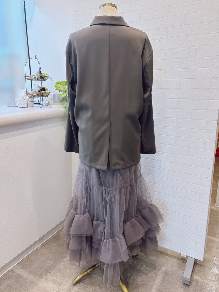 ◇商品について:裾にたっぷりフリルをあしらったチュール素材のキャミワンピースと、ジャケットを組み合わせたセットアイテム。チュールワンピースはハイウエストデザインでゆったりシルエット。マタニティ初期の方も着用できます。程よく張り感のあるチュールワンピースはトップスを変えて華やかに着こなすこともできます。
