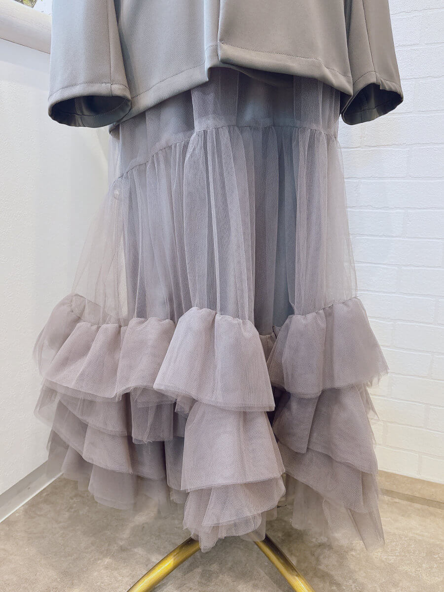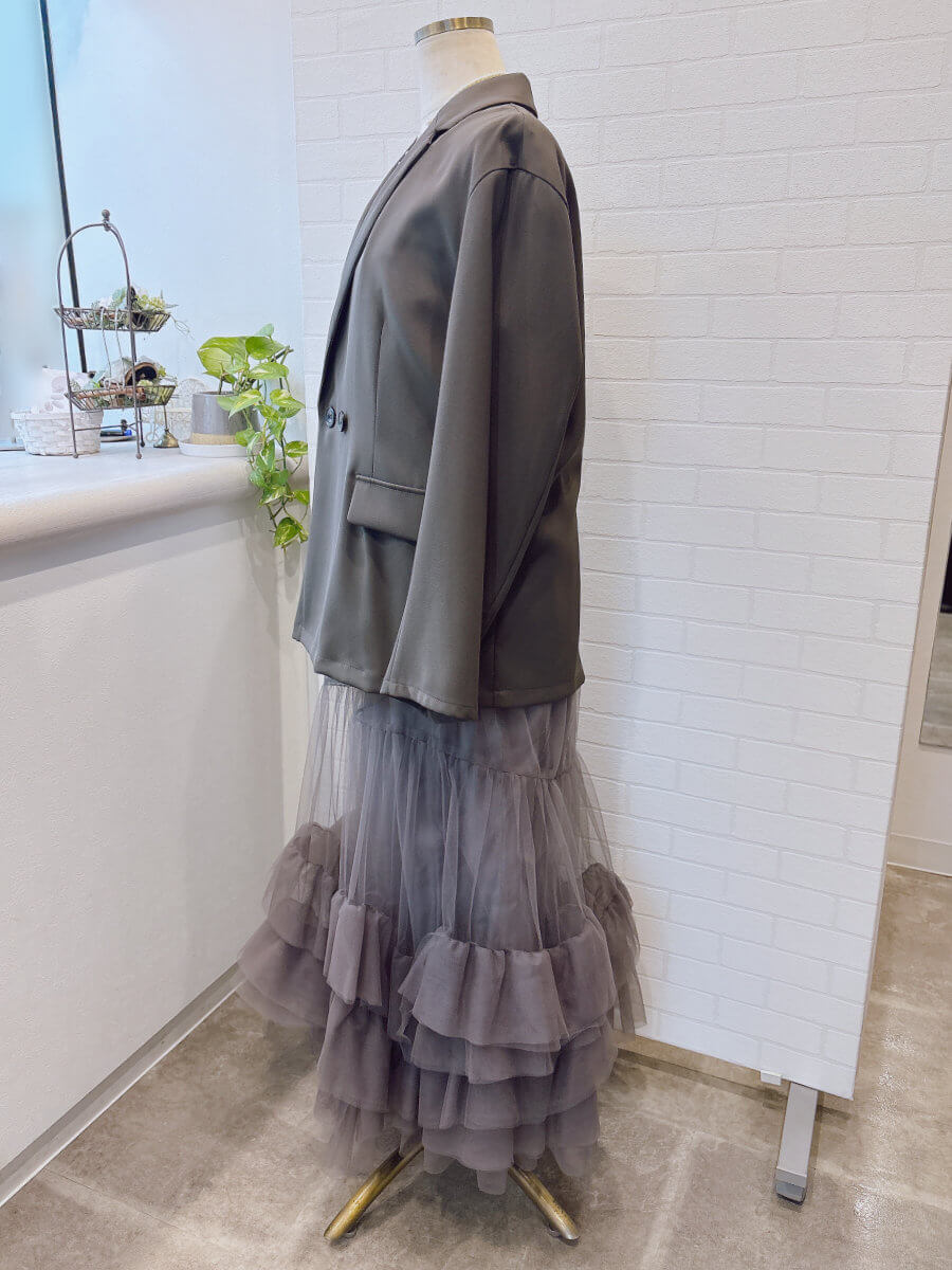 ◇商品について:裾にたっぷりフリルをあしらったチュール素材のキャミワンピースと、ジャケットを組み合わせたセットアイテム。チュールワンピースはハイウエストデザインでゆったりシルエット。マタニティ初期の方も着用できます。程よく張り感のあるチュールワンピースはトップスを変えて華やかに着こなすこともできます。