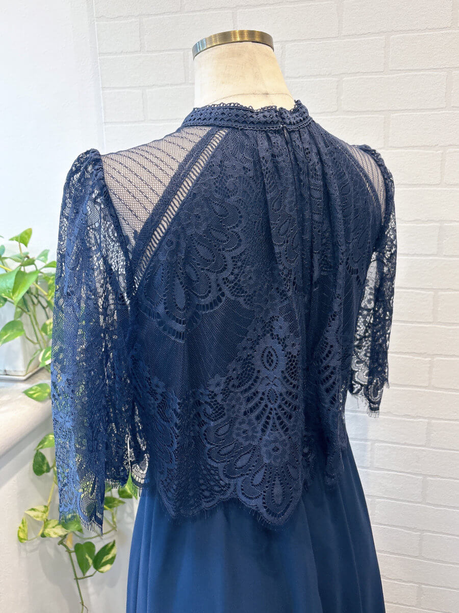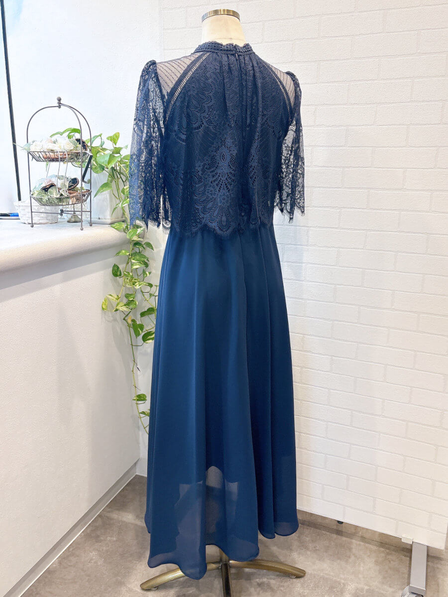 ◇商品について:スカラップレースとシフォン素材を組み合わせたエレガントなドレス。繊細なレースが上品で清楚系なイメージに。フィッシュテールドレスでフレアな裾に動きがでます。肩部分のレースに透け感がありハイネックのデザインにほどよい抜け感をプラスしています。