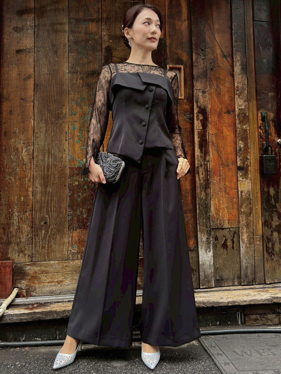 ◇商品について:ブラックのセットアップドレス。インナーはブラックのレースをセット。セパレイトタイプなので楽に一日過ごせます。ワイドパンツで履き心地もよくウエストはゴムが採用されています。ベルトが通せるパンツなのでサイズ合わせも可能。トップスはアジャスター付きで肩紐の調整ができ背部はゴムになっています。レースのインナーは透けるので下着は気を付けて頂きたいですがデザイン性もありおしゃれに楽に着こなせるパンツドレスです。
