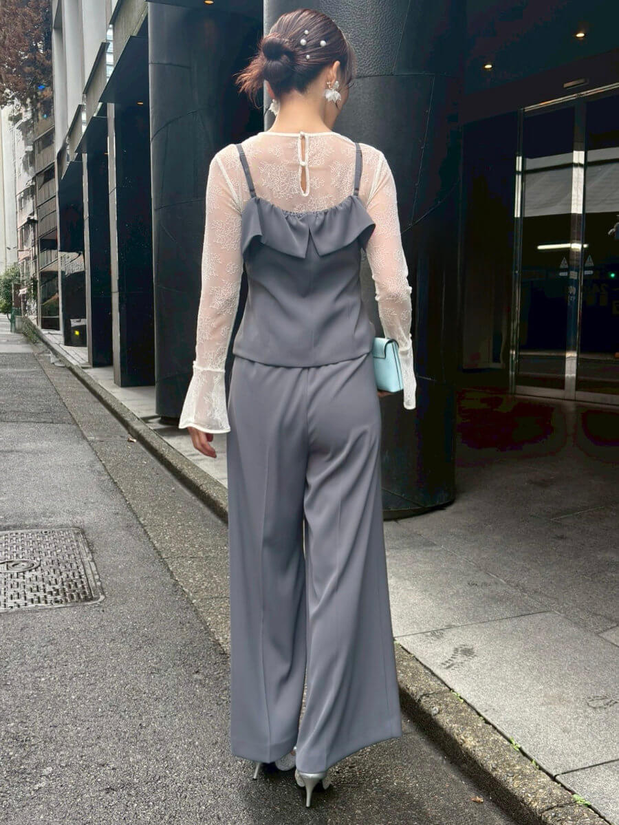 ◇商品について:チャコールグレーのセットアップドレス。インナーはアイボリーのレースをセット。セパレイトタイプなので楽に一日過ごせます。ワイドパンツで履き心地もよくウエストはゴムが採用されています。ベルトが通せるパンツなのでサイズ合わせも可能。トップスはアジャスター付きで肩紐の調整ができ背部はゴムになっています。レースのインナーは透けるので下着は気を付けて頂きたいですがデザイン性もありおしゃれに楽に着こなせるパンツドレスです。