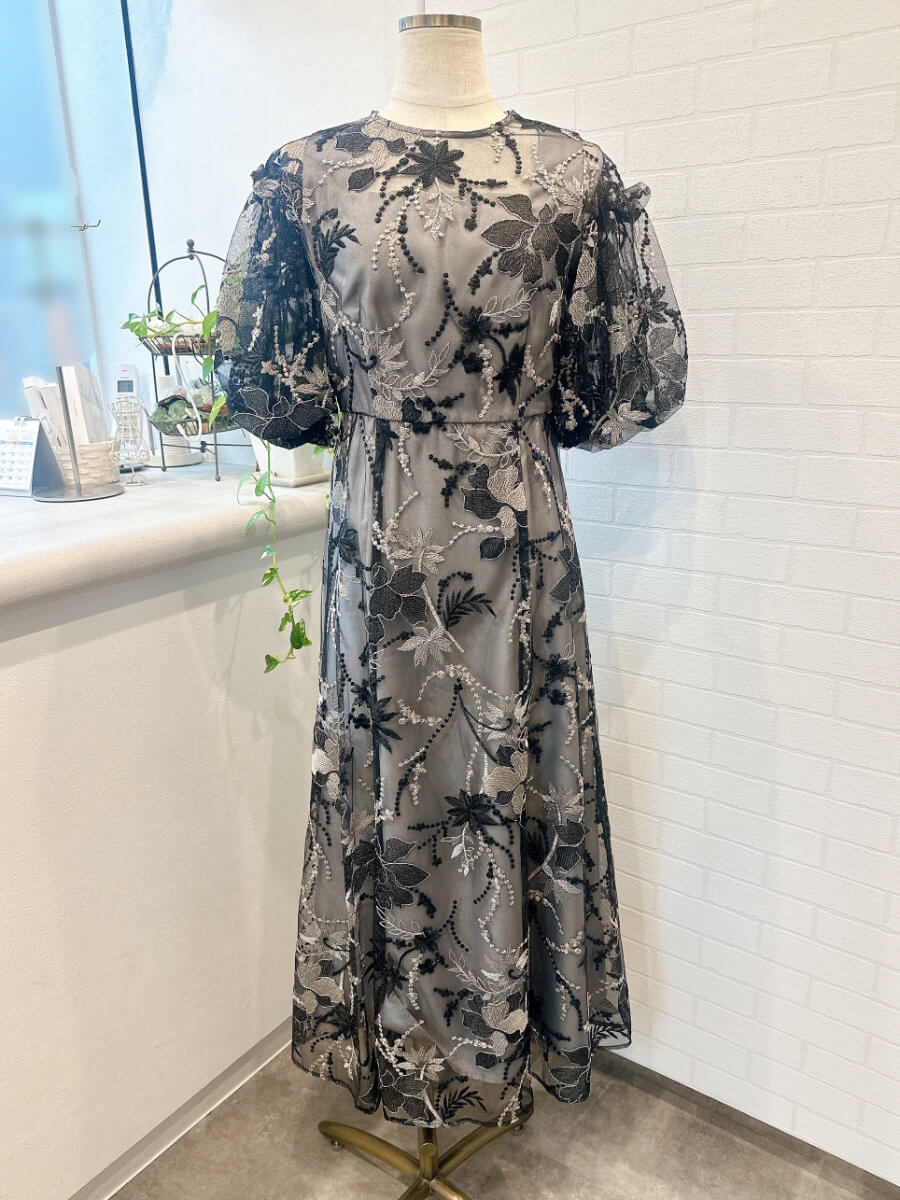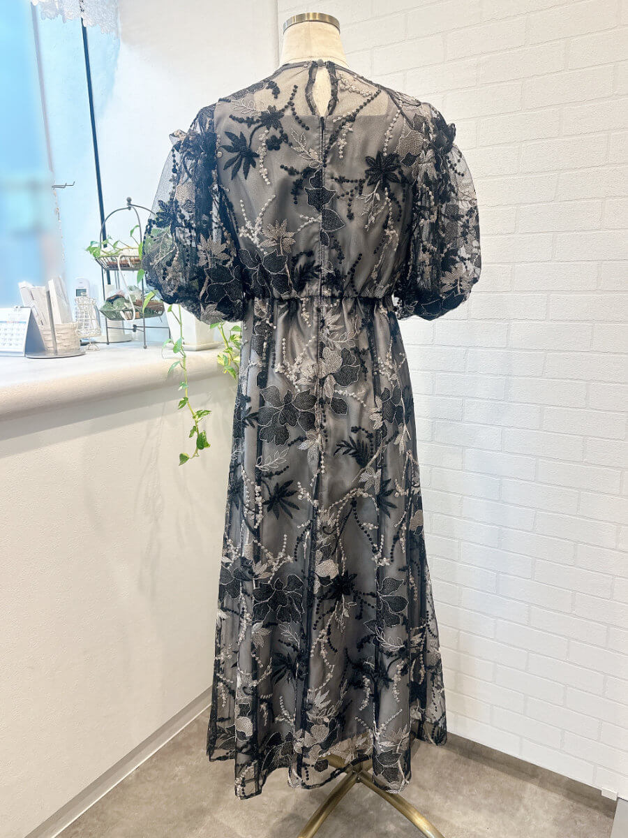 ◇商品について:総レースのパフスリーブドレス。袖部分はゴムなので二の腕部分が不安な方も安心して着用できる設計。ウエスト背部もゴム使用で楽ちんな着心地。肩紐部分は太目なので下着も気にせずに着用できます。上品で華やかな刺繍なので幅広い年齢層の方に着用して頂けます。ブラックとシルバーの刺繍が施されていてブラックだからこそシルバーが映えるので華やかになります。