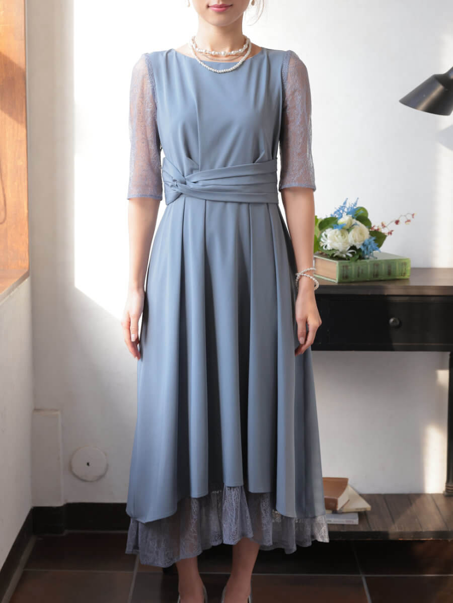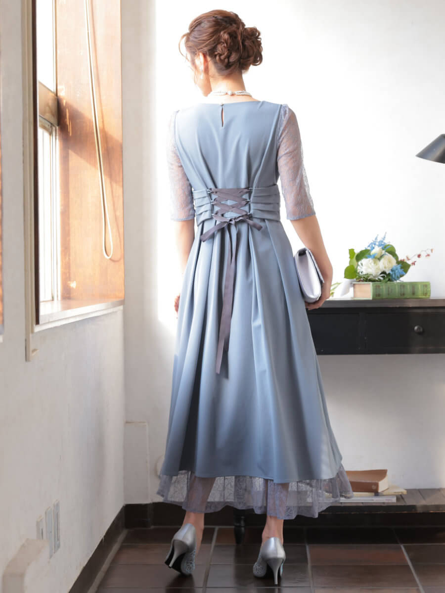 ◇商品について:光沢感のある生地にレースのインナーがレイヤード。フィッシュテールのデザインで横からの姿も美しいドレスです。ウエストは太目のラインで絞られておりレースアップドレスなのでおサイズ調整もできるため、ご自身の体型に合わせて着れるドレスです。定番ドレスとして様々なシーンでご着用できます。
