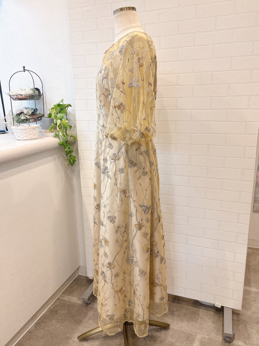 ◇商品について:繊細なフラワー刺繍を全面にあしらった気品あふれるドレスです。透け感のあるチュール素材が軽やかで女性らしい印象を演出します。落ち着いたニュアンスカラーが甘さを抑え結婚式やパーティだけでなくお食事会など幅広いシーンに対応します。ウエストはゴムが採用されておりサイズ調整が可能です。