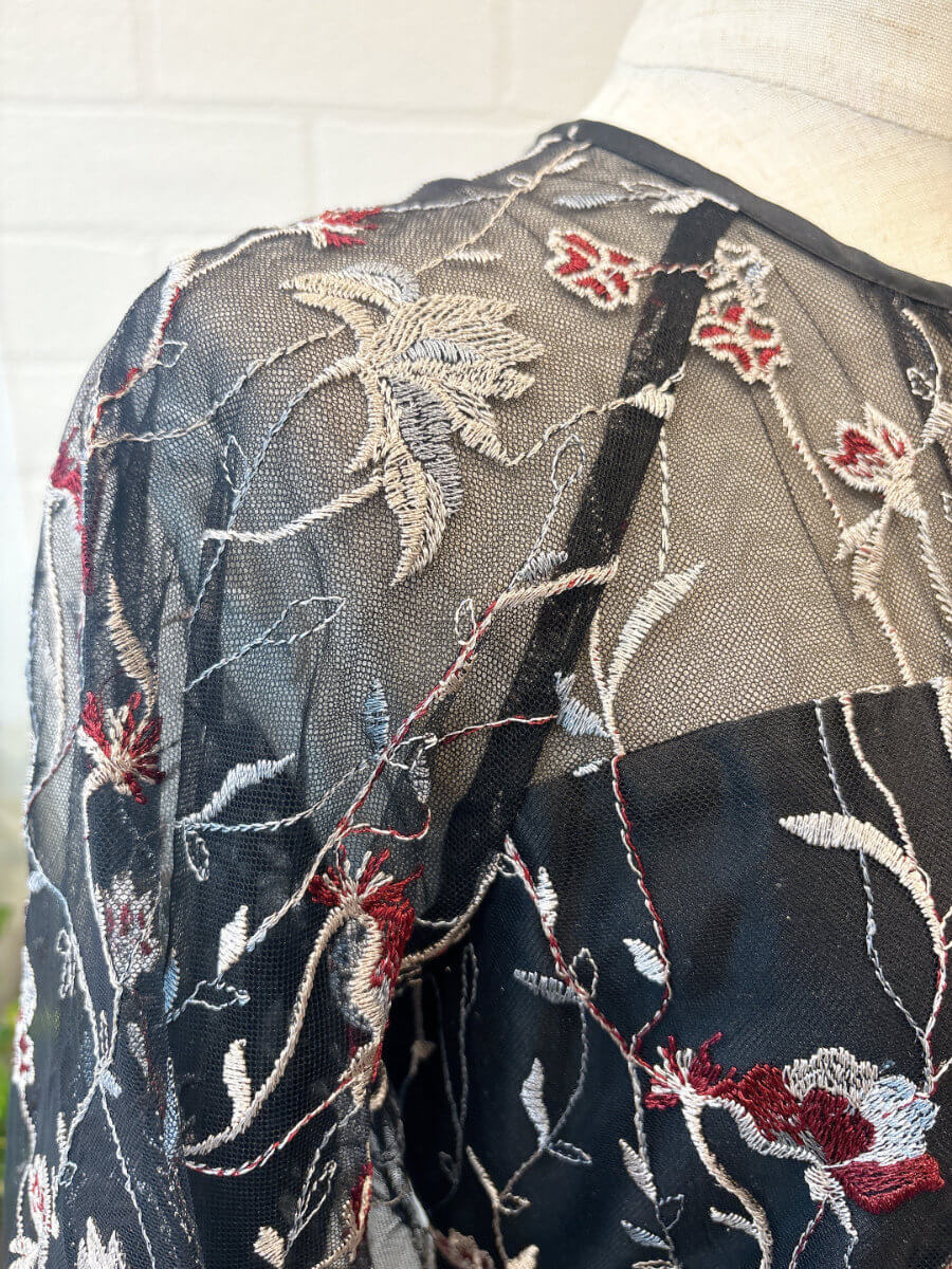 ◇商品について:繊細なフラワー刺繍を全体に施した上品なドレスです。落ち着いたダークトーンに程よい透け感のある袖とデコルテが軽やかさを添えて華やかさと品の良さを両立。ウエスト切り返しですっきりしたシルエットで結婚式、パーティ、お食事会など幅広いシーンで活躍するドレスです。ブラックに赤、ブルー、シルバーの個性のある刺繍がレトロ感もあり大人なドレスです。