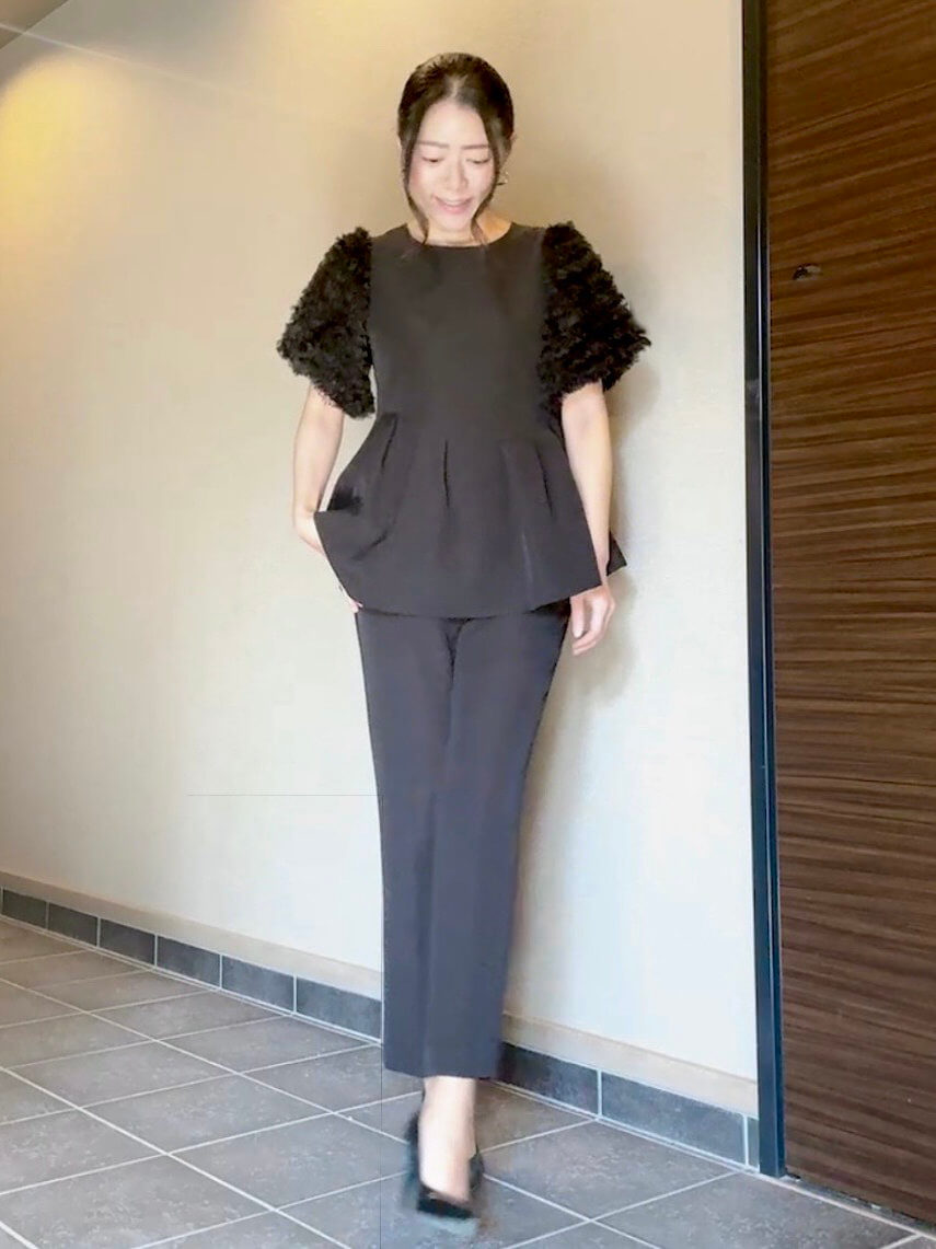 ◇商品について:ブラックのセットアップパンツドレスです。チュールのボリューム袖とアシンメトリ―なペプラムのトップスがシンプルなパンツを上品に華やかに。パンツはスッキリしたシルエットでトップスとのメリハリがあります。結婚式だけでなくパーティやお食事会、会社のセレモニーなど幅広くご利用頂けます。