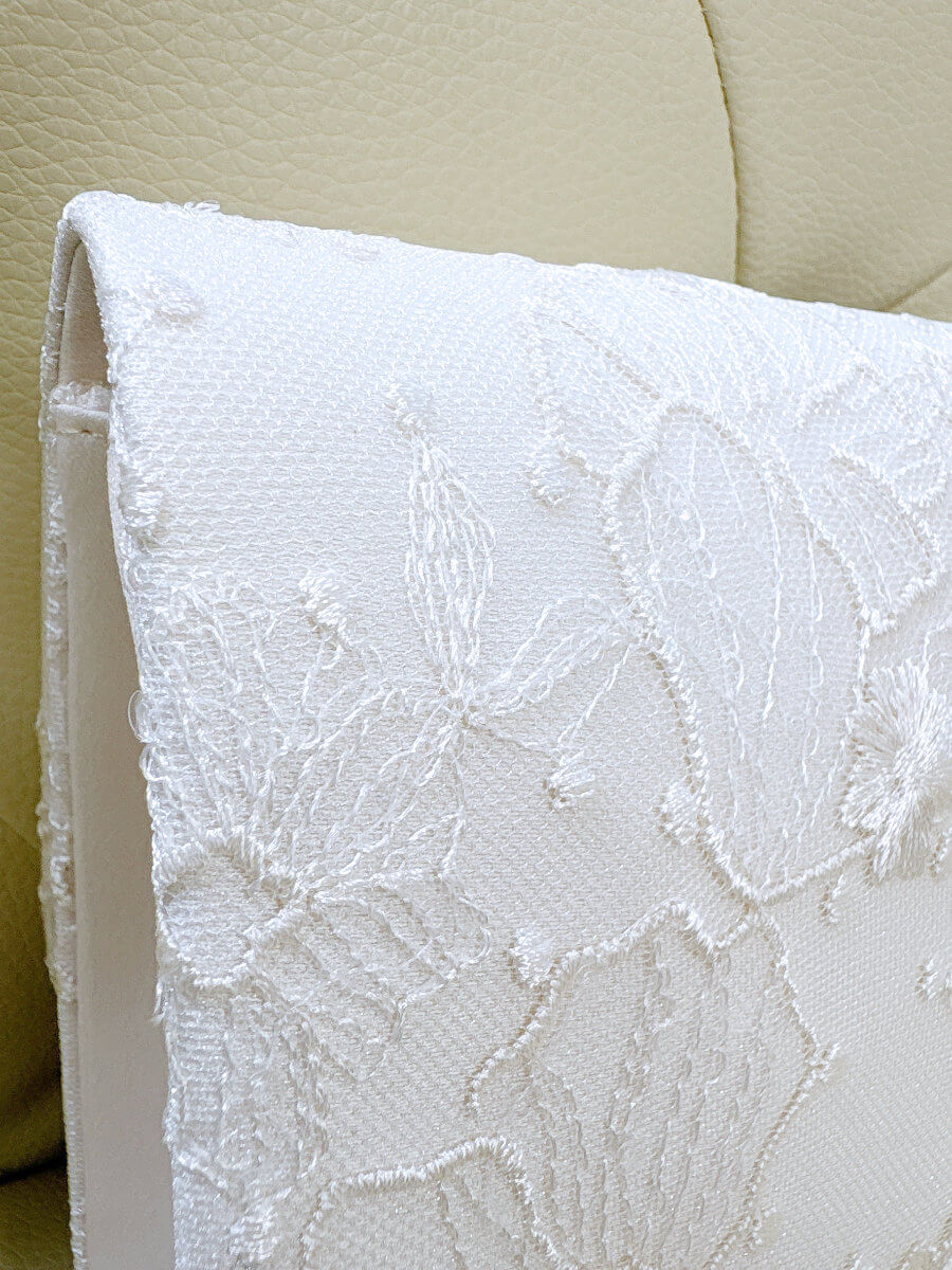 ◇商品について:オフホワイトカラーのベージュバッグ全体を刺繍レースで包み込んだバッグです。クリアのスパンコールが時折光るコロンとした