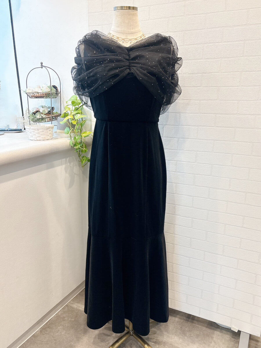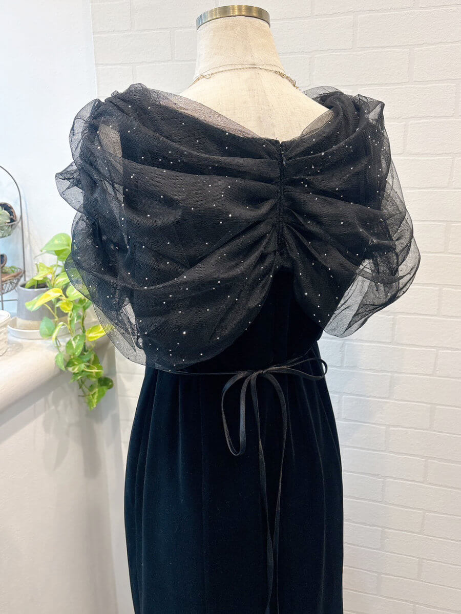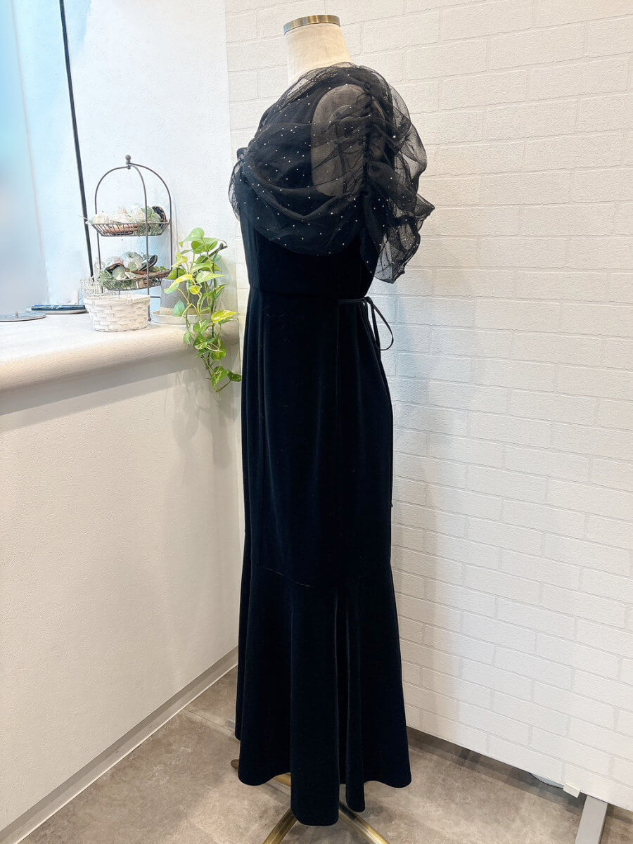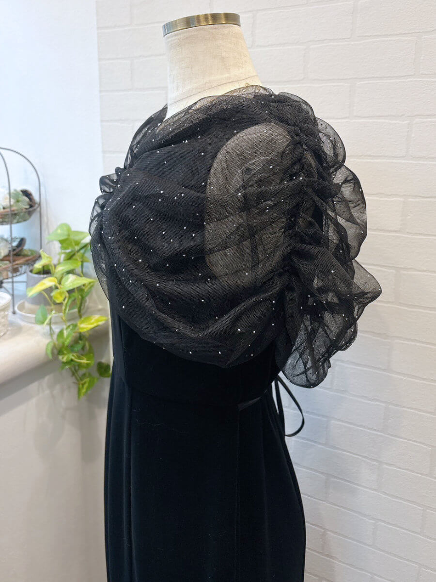 ◇商品について:上品な輝きのあるドットのチュールと柔らかなベロアの組み合わせが華やかなドレスです。