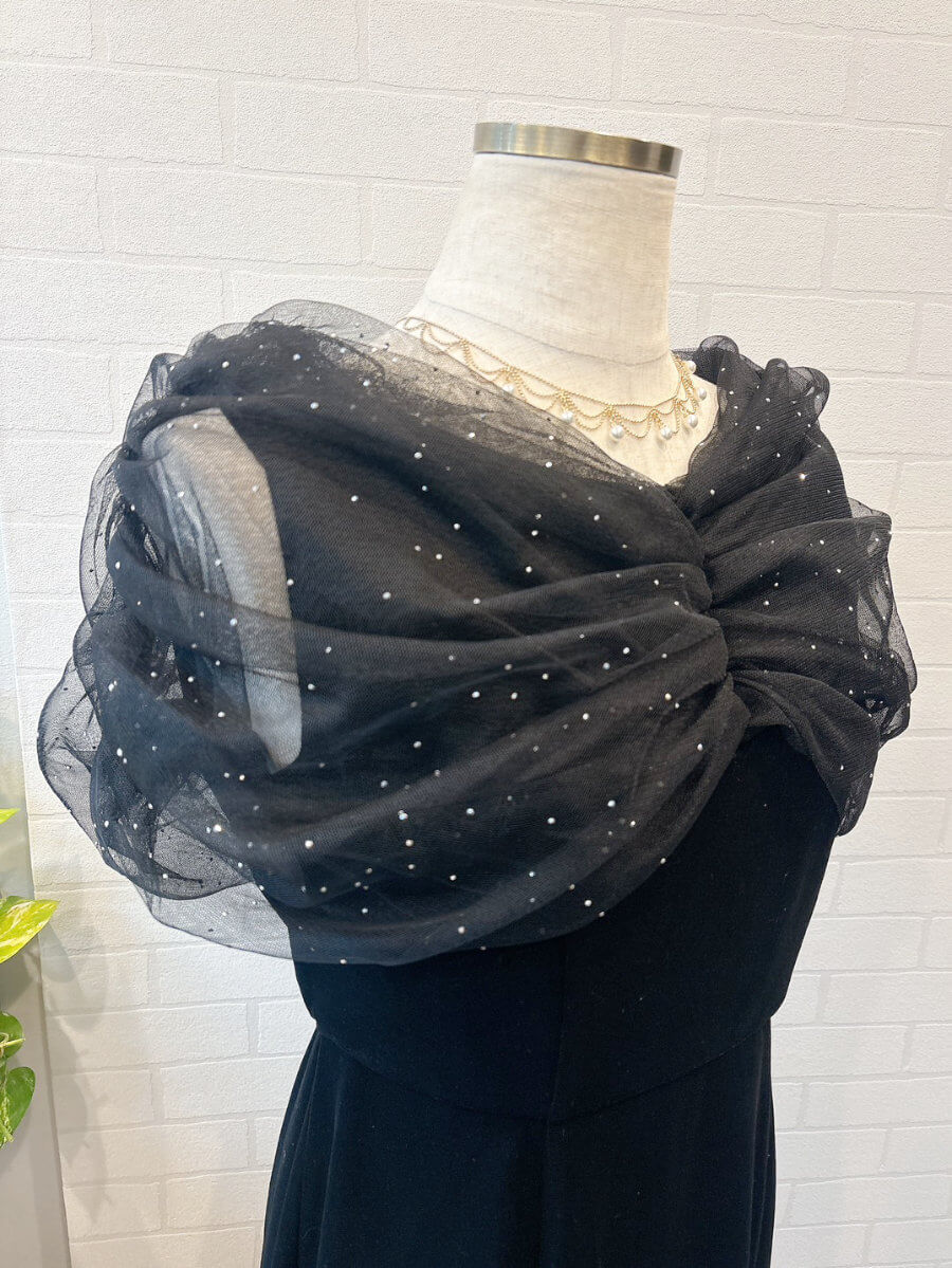 繊細なふんわりチュールが肩周りを包み込みケープを羽織っているようなシルエットに。
