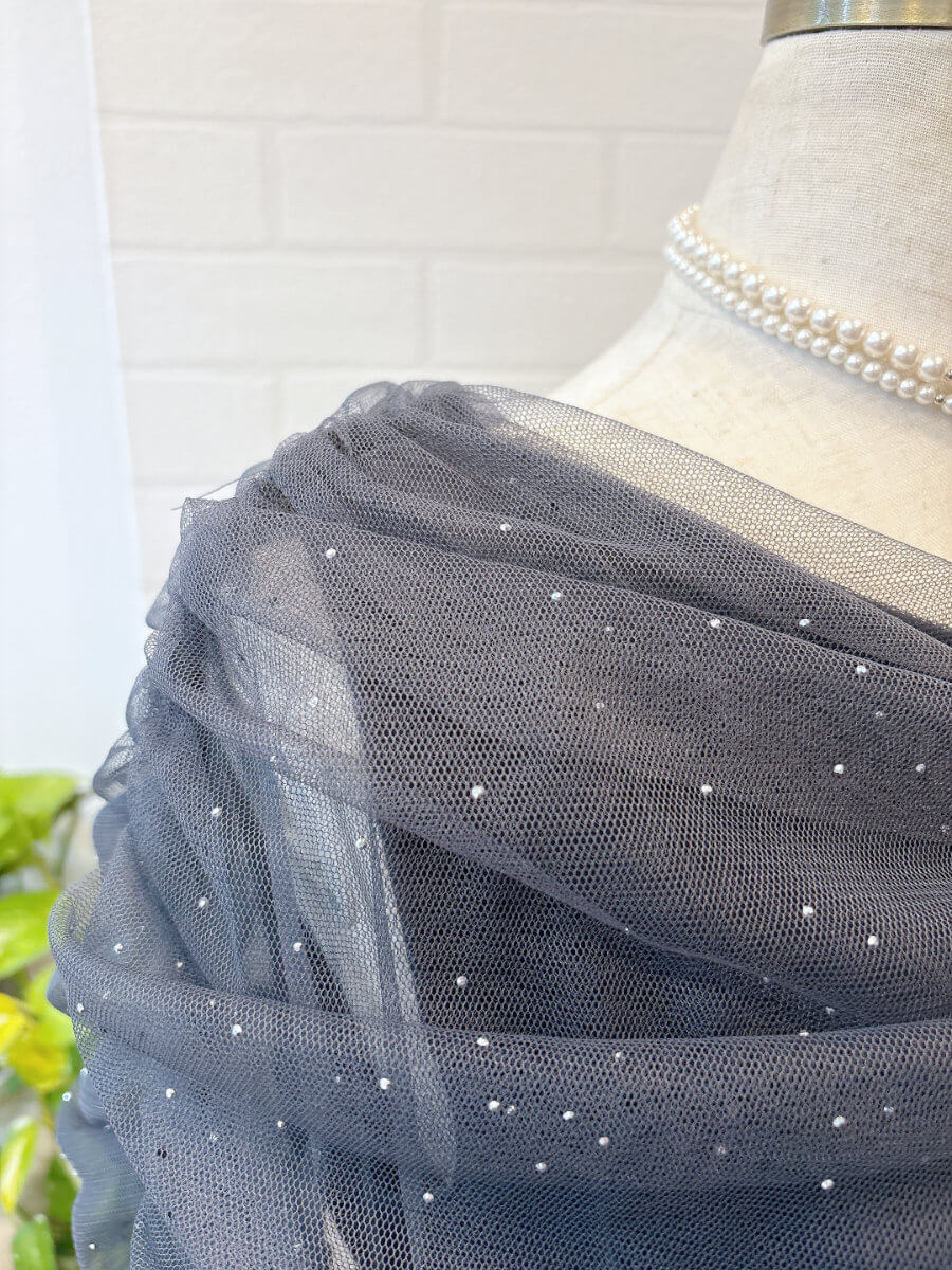 繊細なふんわりチュールが肩周りを包み込みケープを羽織っているようなシルエットに。