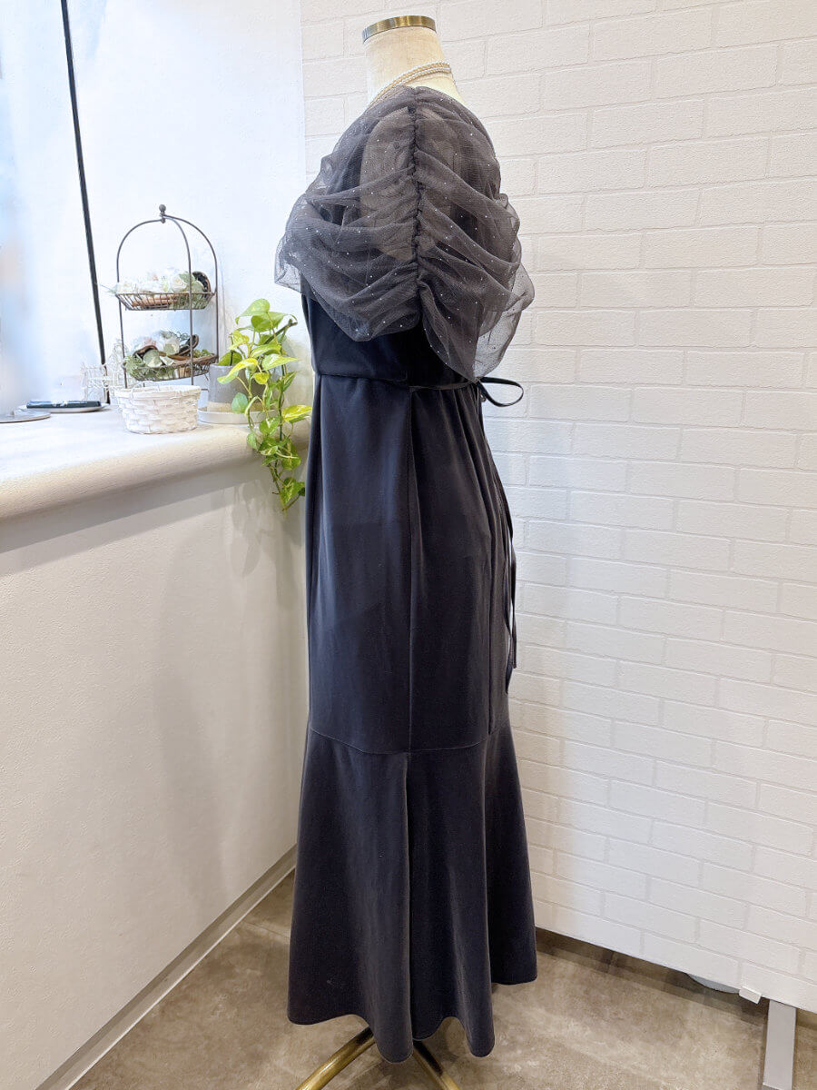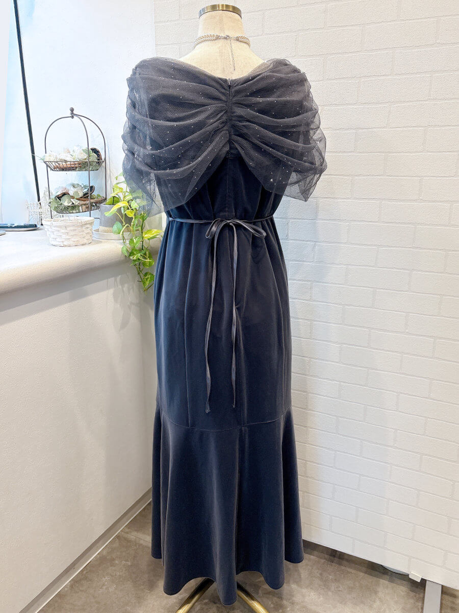 ◇商品について:上品な輝きのあるドットのチュールと柔らかなベロアの組み合わせが華やかなドレスです。