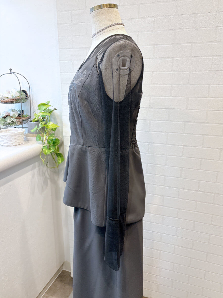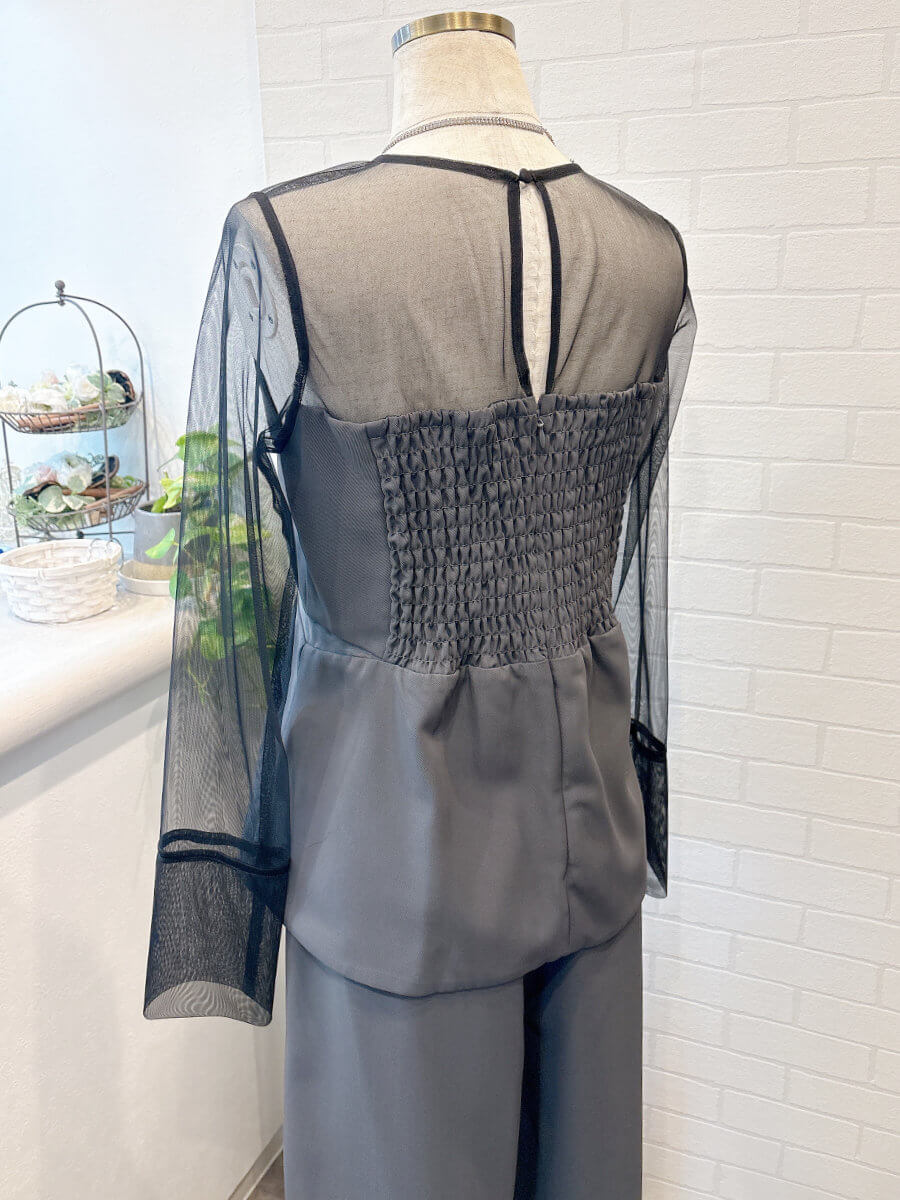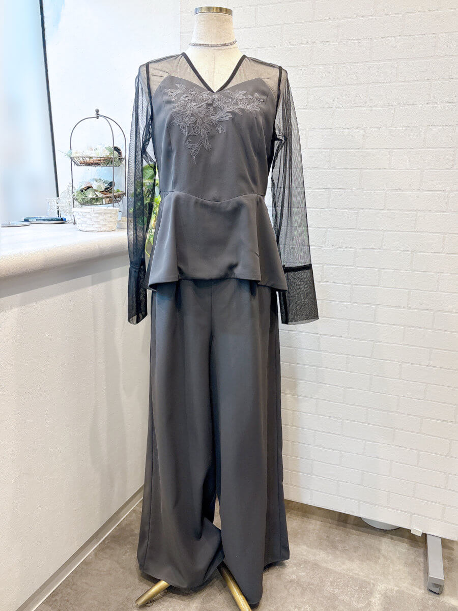 ◇商品について:シアーのインナーがドッキングされたセットアップパンツドレスです。ほどよいペプラムですっきりシルエットに。シアーはブラックを組み合わせて上品に。胸元はVネックなのでつまったデザインが主流の昨今には珍しくお探しの方にはうれしい商品です。上品な刺繍は同系色で施されておりウエストサイド部分に実はシアーで抜け感をいれています。気づかれないくらいのさりげなさで透け感がありファッション性のある商品です。パンツはワイドで美しいラインが際立ちます。トップス、パンツ共に背部にゴムが採用されておりサイズ調整が可能です