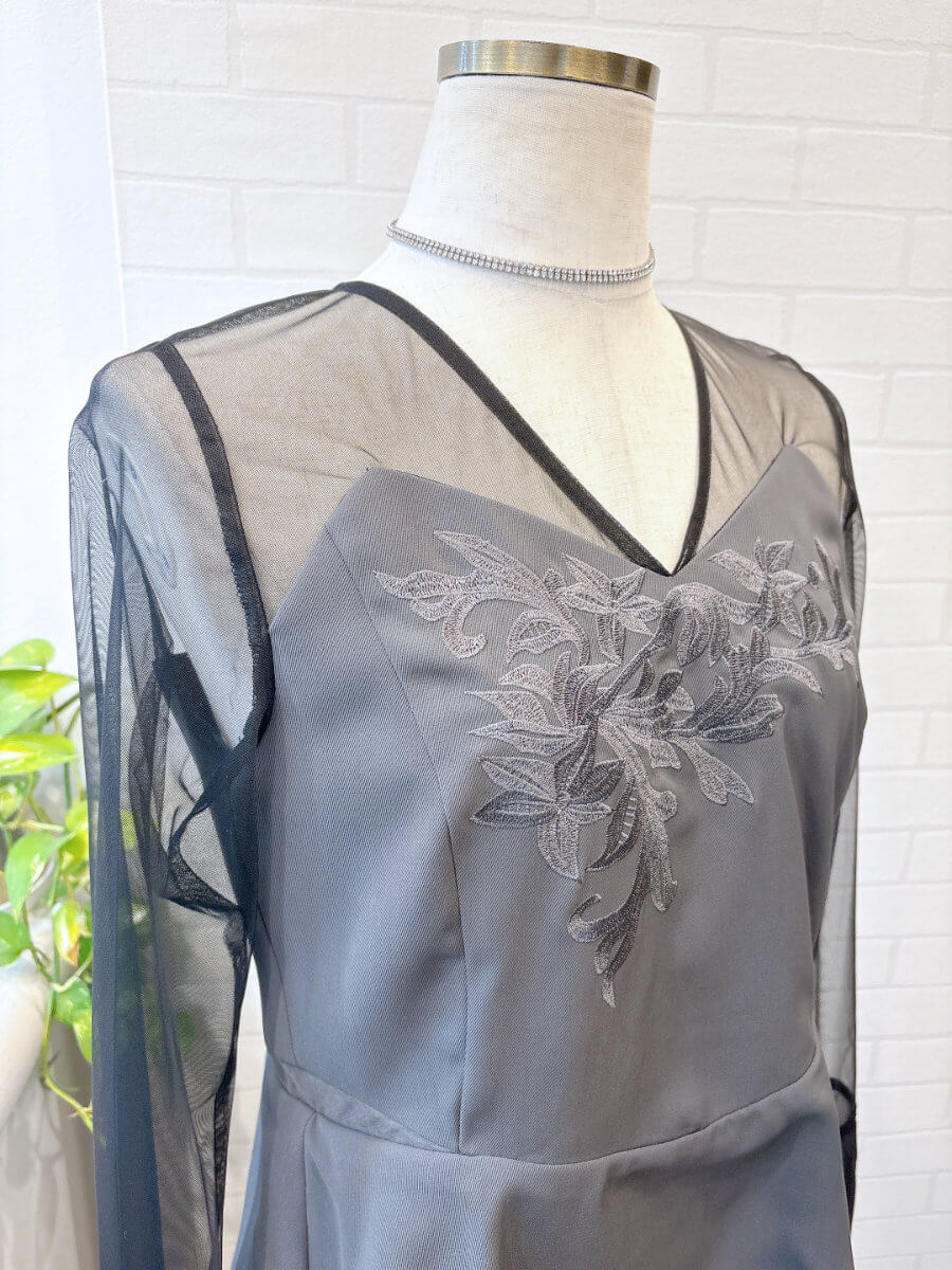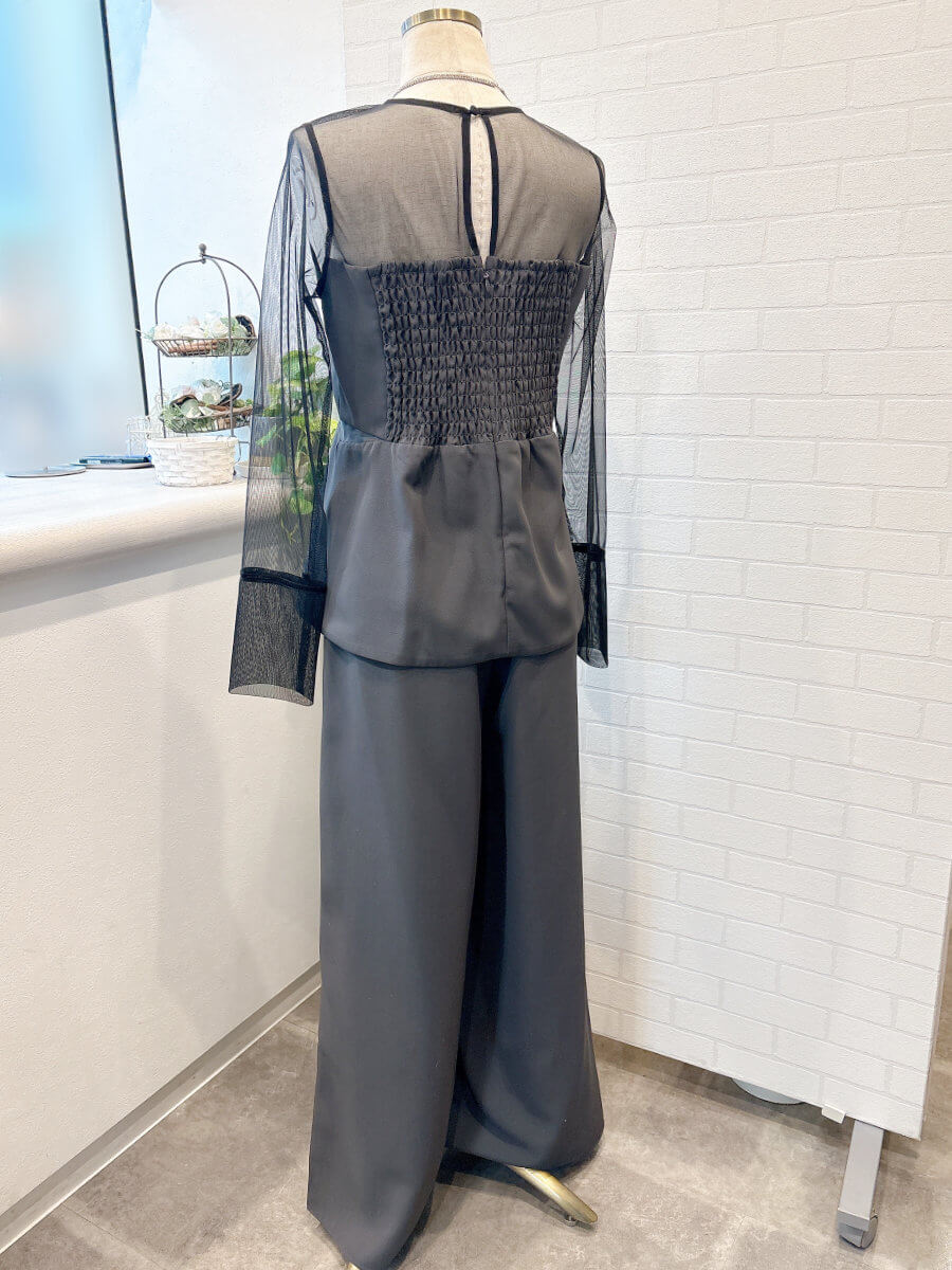 ◇商品について:シアーのインナーがドッキングされたセットアップパンツドレスです。ほどよいペプラムですっきりシルエットに。シアーはブラックを組み合わせて上品に。胸元はVネックなのでつまったデザインが主流の昨今には珍しくお探しの方にはうれしい商品です。上品な刺繍は同系色で施されておりウエストサイド部分に実はシアーで抜け感をいれています。気づかれないくらいのさりげなさで透け感がありファッション性のある商品です。パンツはワイドで美しいラインが際立ちます。トップス、パンツ共に背部にゴムが採用されておりサイズ調整が可能です