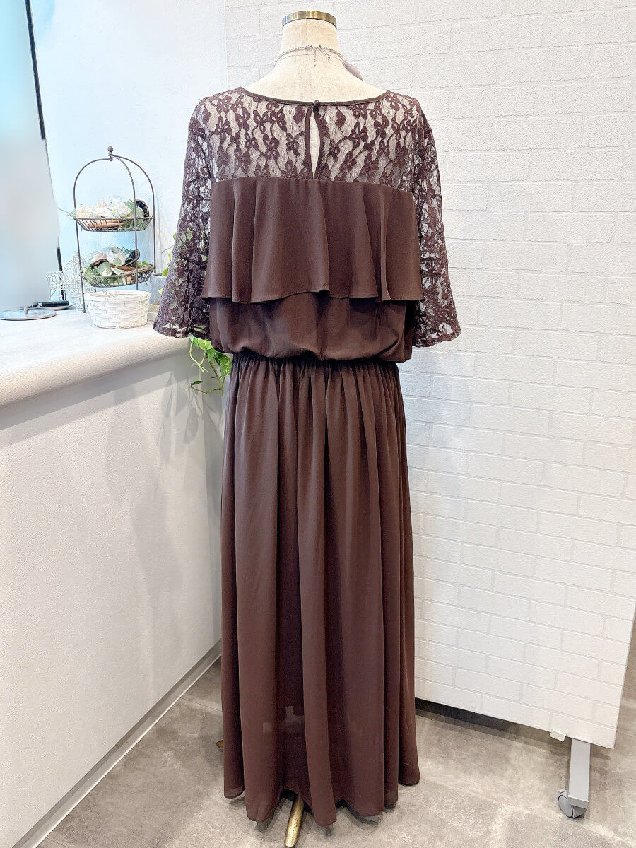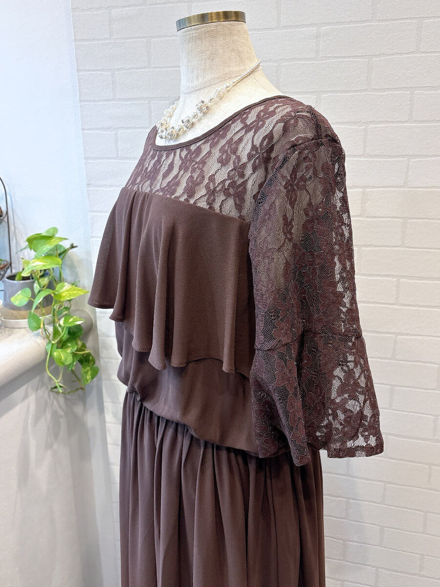 ◇商品について:ウエストがゴムなので伸縮性があります。胸元のフレアと高めの切り返しで足長効果があります。シンプルで上品なシフォンスカートはセミフレアなのでボリュームを抑えてくれます。デコルテのレースで抜け感をプラス。重く見えがちが胸元フリルもすっきり感がでます。ボタンひとつで脱着ができるのでファスナーが苦手な方に嬉しい一着です。