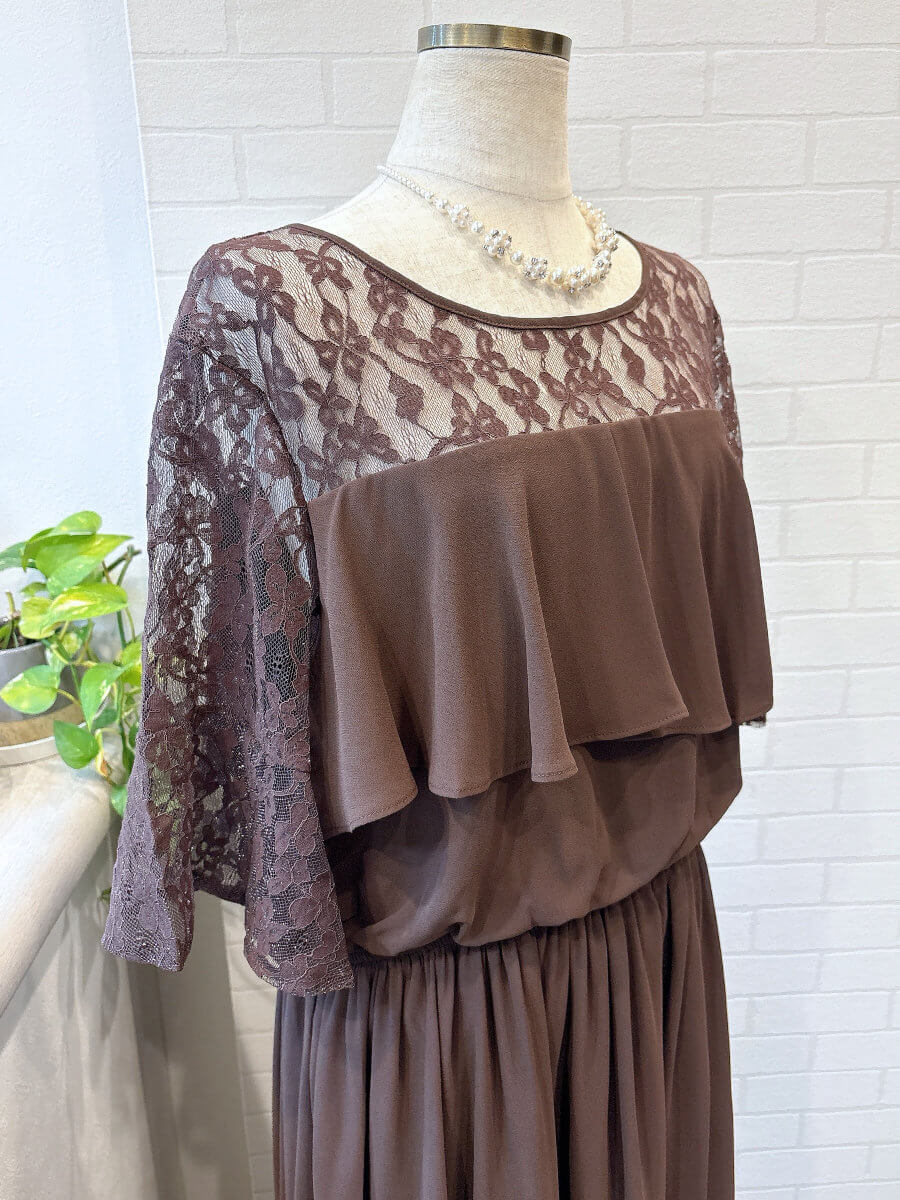 ◇商品について:ウエストがゴムなので伸縮性があります。胸元のフレアと高めの切り返しで足長効果があります。シンプルで上品なシフォンスカートはセミフレアなのでボリュームを抑えてくれます。デコルテのレースで抜け感をプラス。重く見えがちが胸元フリルもすっきり感がでます。ボタンひとつで脱着ができるのでファスナーが苦手な方に嬉しい一着です。