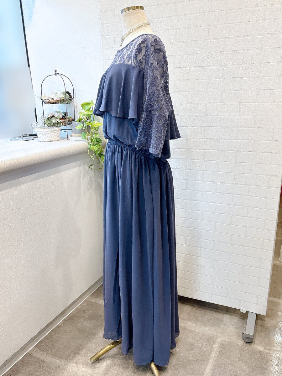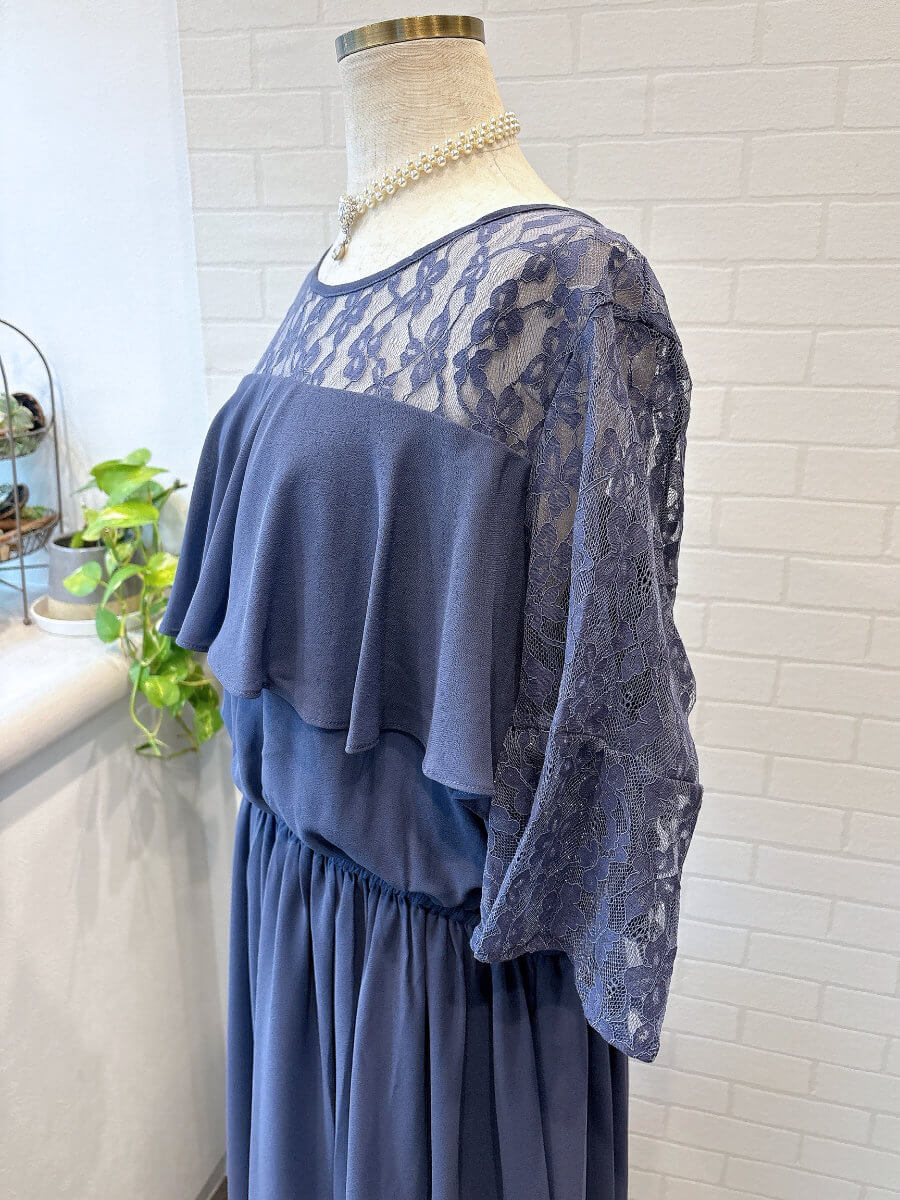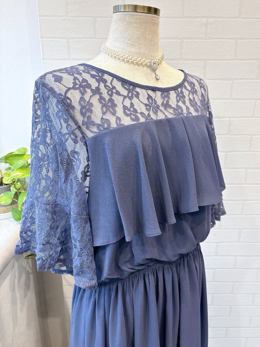 ◇商品について:ウエストがゴムなので伸縮性があります。胸元のフレアと高めの切り返しで足長効果があります。シンプルで上品なシフォンスカートはセミフレアなのでボリュームを抑えてくれます。デコルテのレースで抜け感をプラス。重く見えがちが胸元フリルもすっきり感がでます。ボタンひとつで脱着ができるのでファスナーが苦手な方に嬉しい一着です。