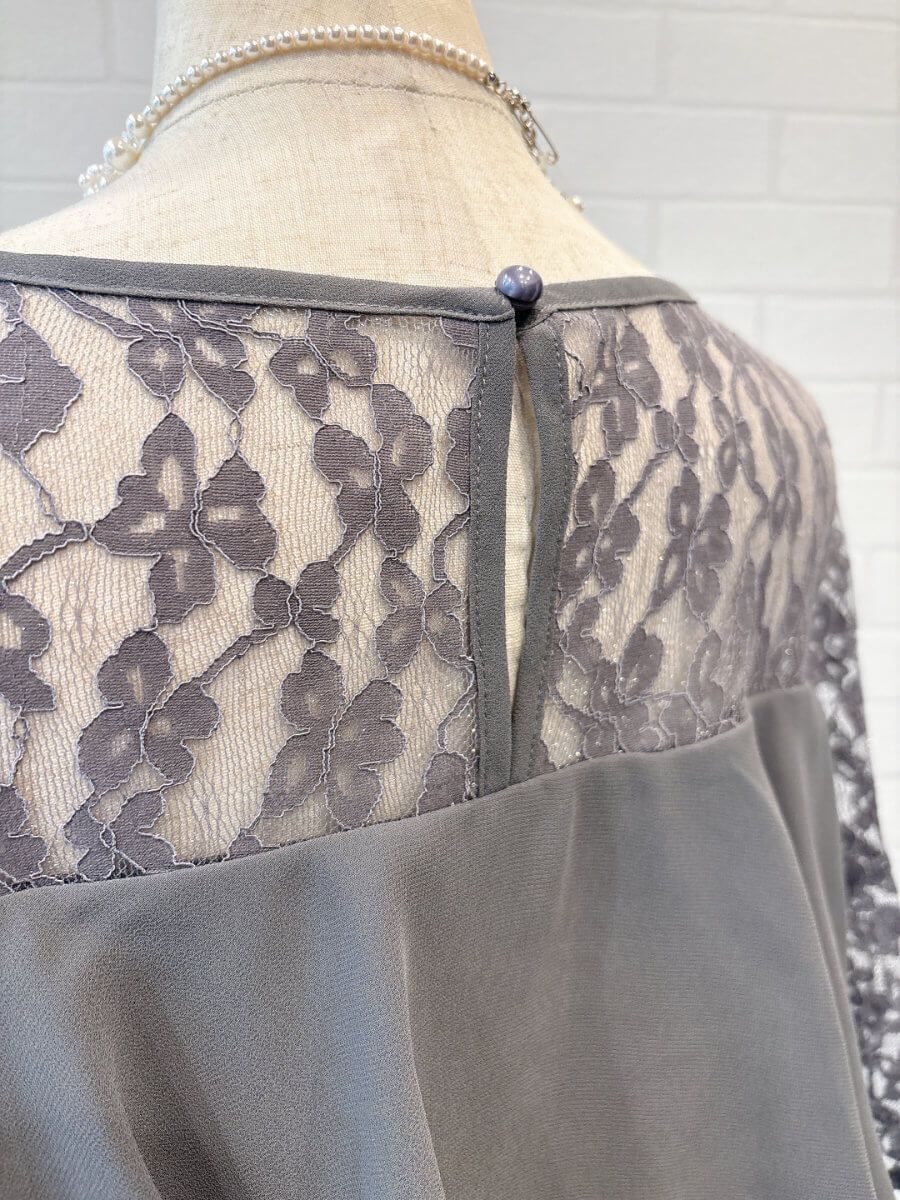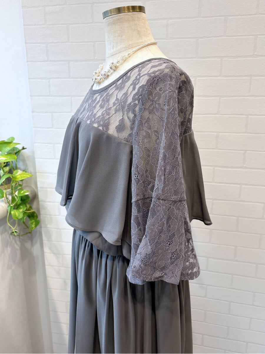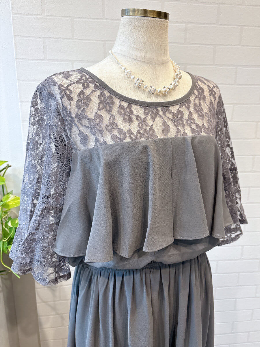 ◇商品について:ウエストがゴムなので伸縮性があります。胸元のフレアと高めの切り返しで足長効果があります。シンプルで上品なシフォンスカートはセミフレアなのでボリュームを抑えてくれます。デコルテのレースで抜け感をプラス。重く見えがちが胸元フリルもすっきり感がでます。ボタンひとつで脱着ができるのでファスナーが苦手な方に嬉しい一着です。