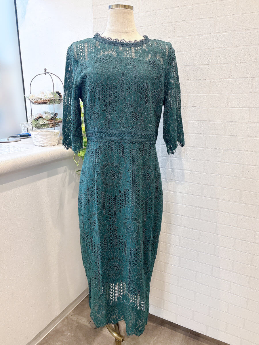 ◇商品について:フラワー柄の総レースがエレガントなタイトシルエットのミモレ丈ワンピースドレス