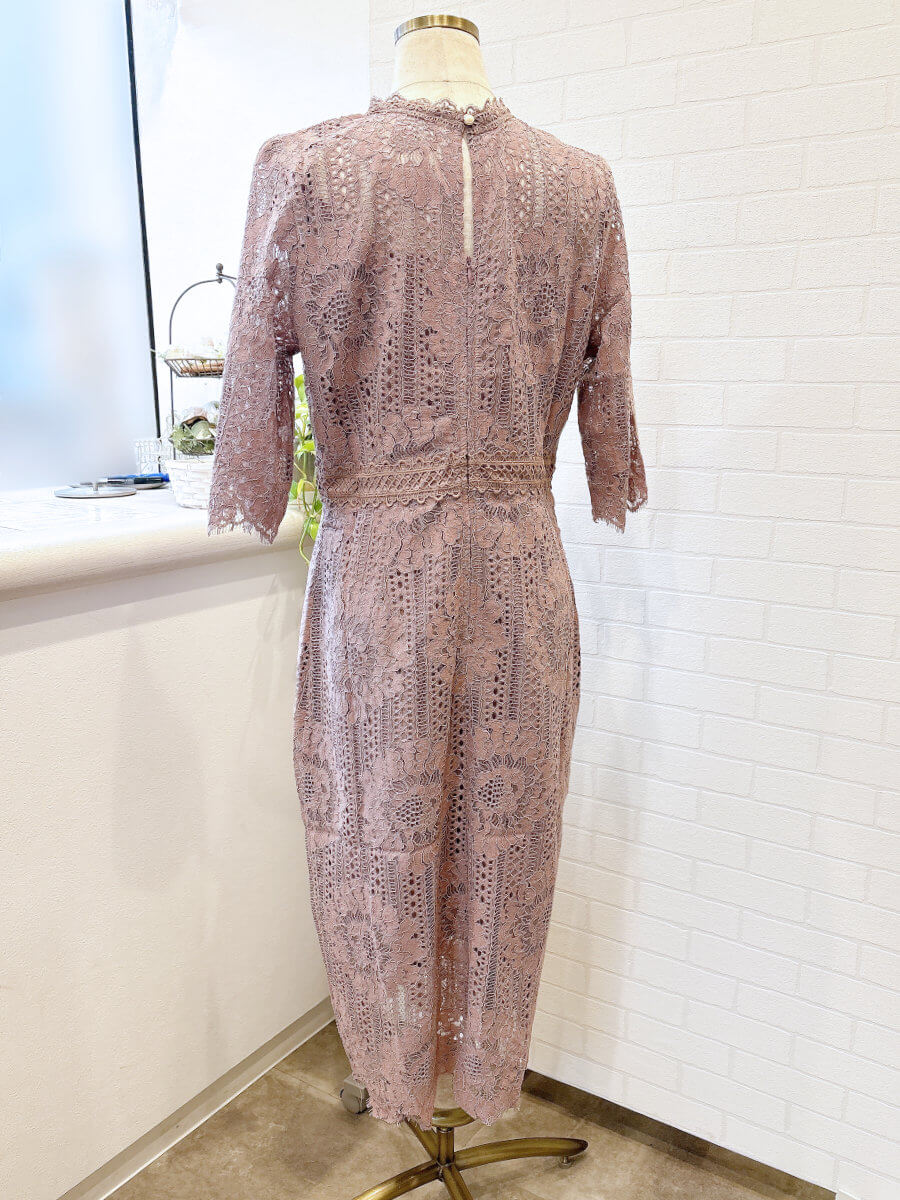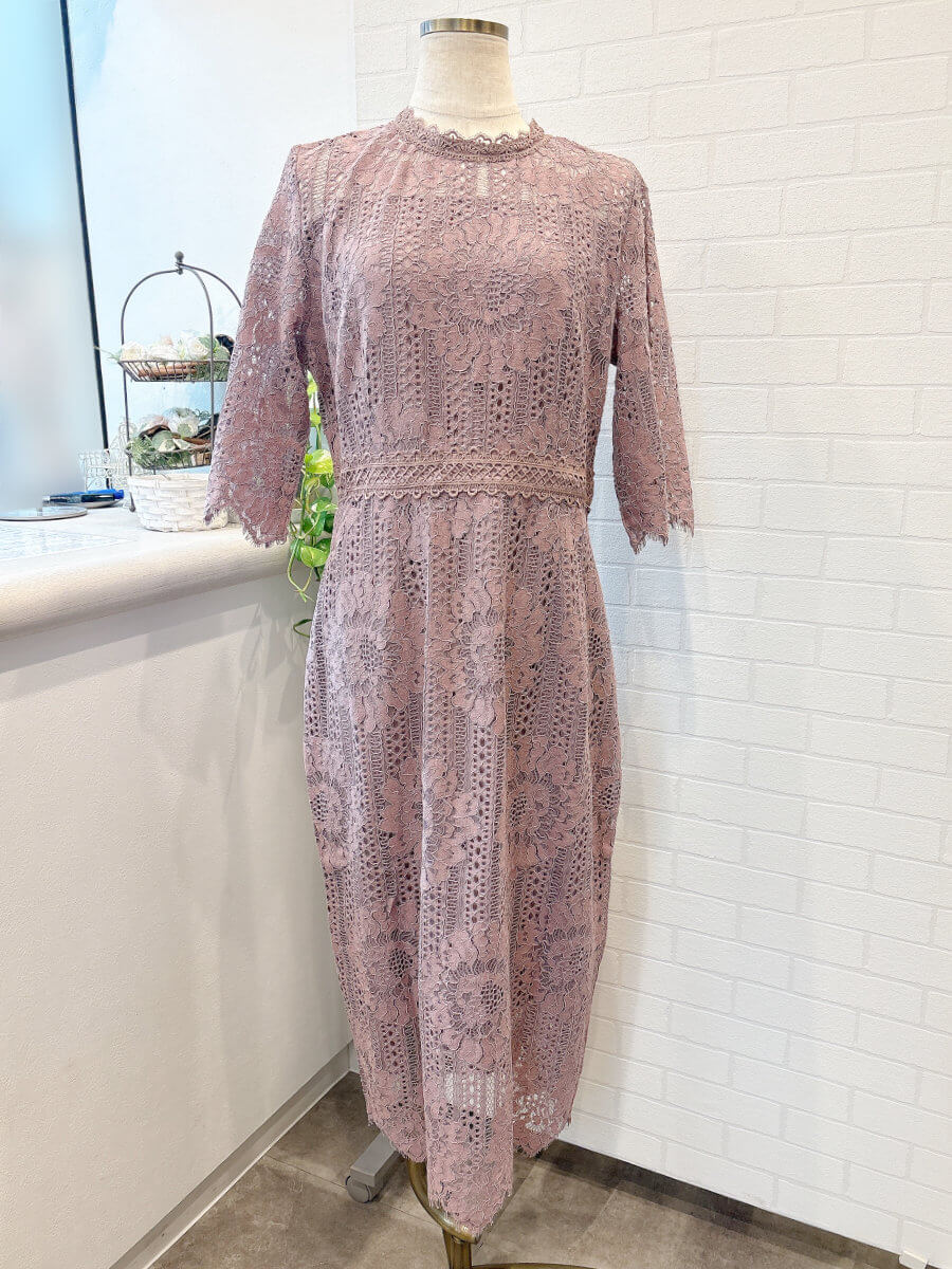 ◇商品について:フラワー柄の総レースがエレガントなタイトシルエットのミモレ丈ワンピースドレス