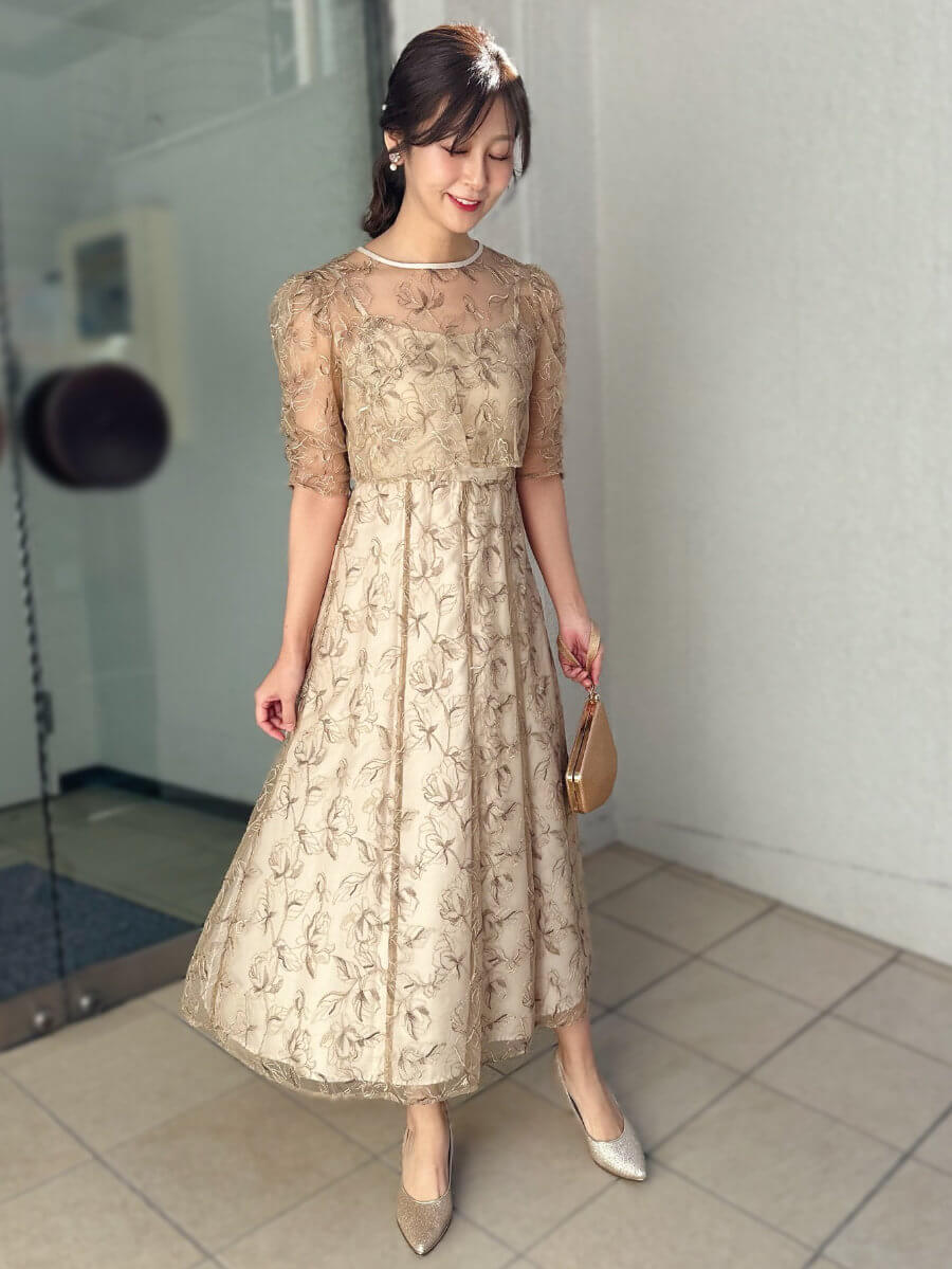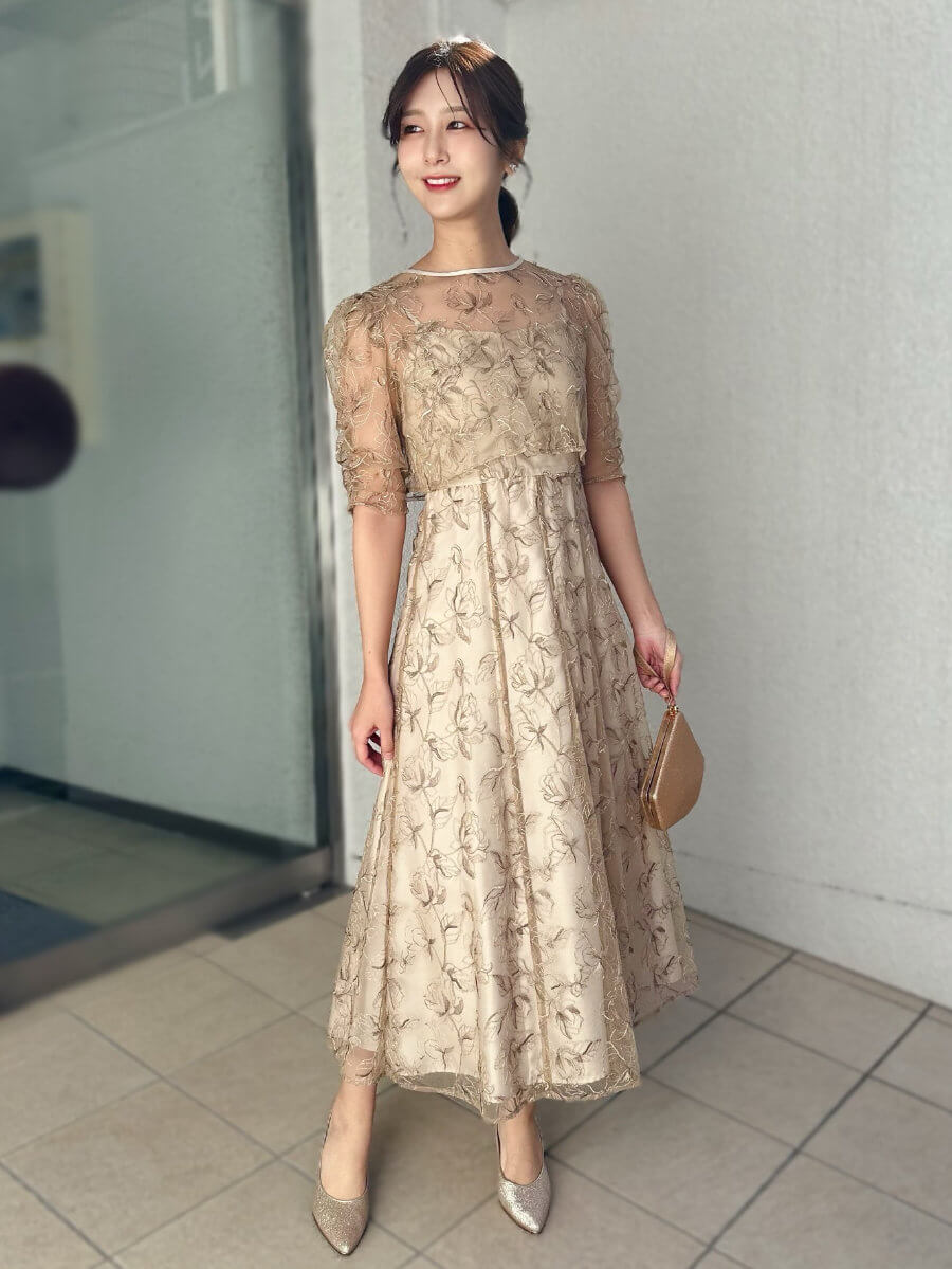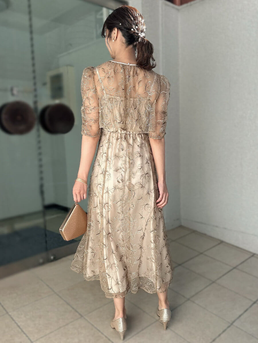 ◇商品について:花柄の刺繍レースを使用した2ピースドレス。ウエストとバスト部分は背部がゴムになっておりサイズ調整が可能。キャミソールワンピースなので肩紐で丈感の調整もできます。くすみ系のお色味で優しい雰囲気に。カシュクール袖で気になる二の腕もうまくカバーしてくれます。ハイウエストなので足長効果とお腹周りカバーもされます。可憐で上品なドレスです。