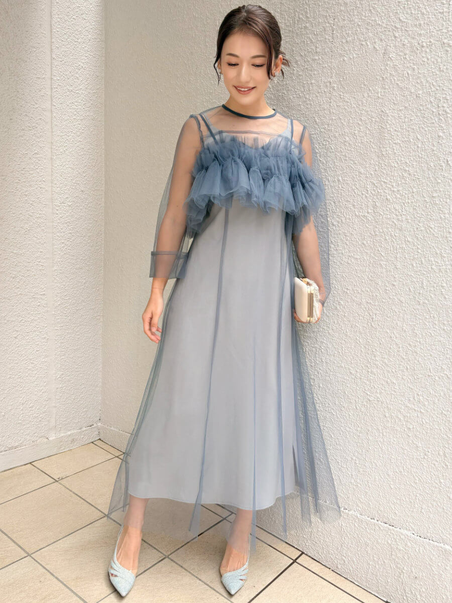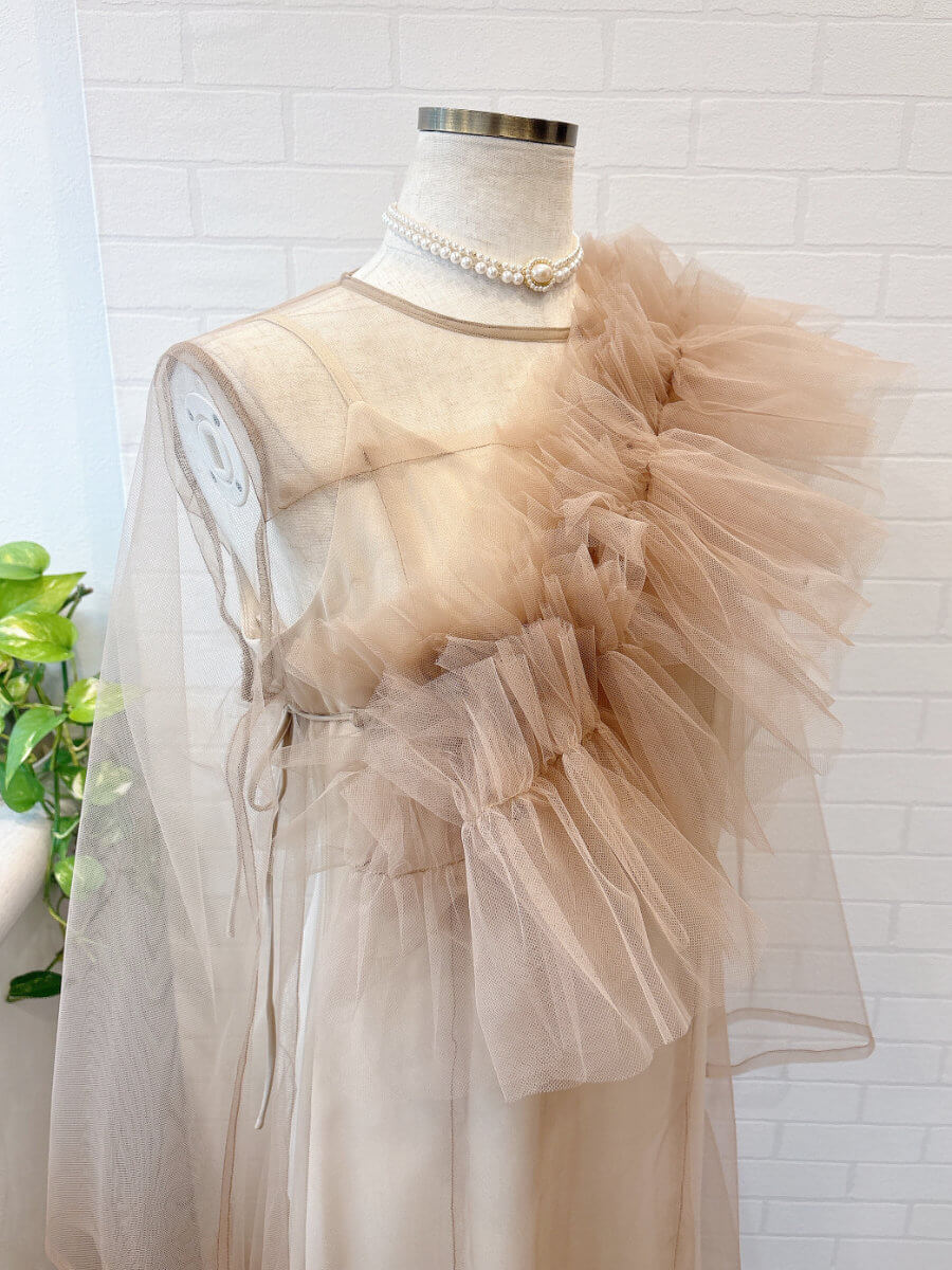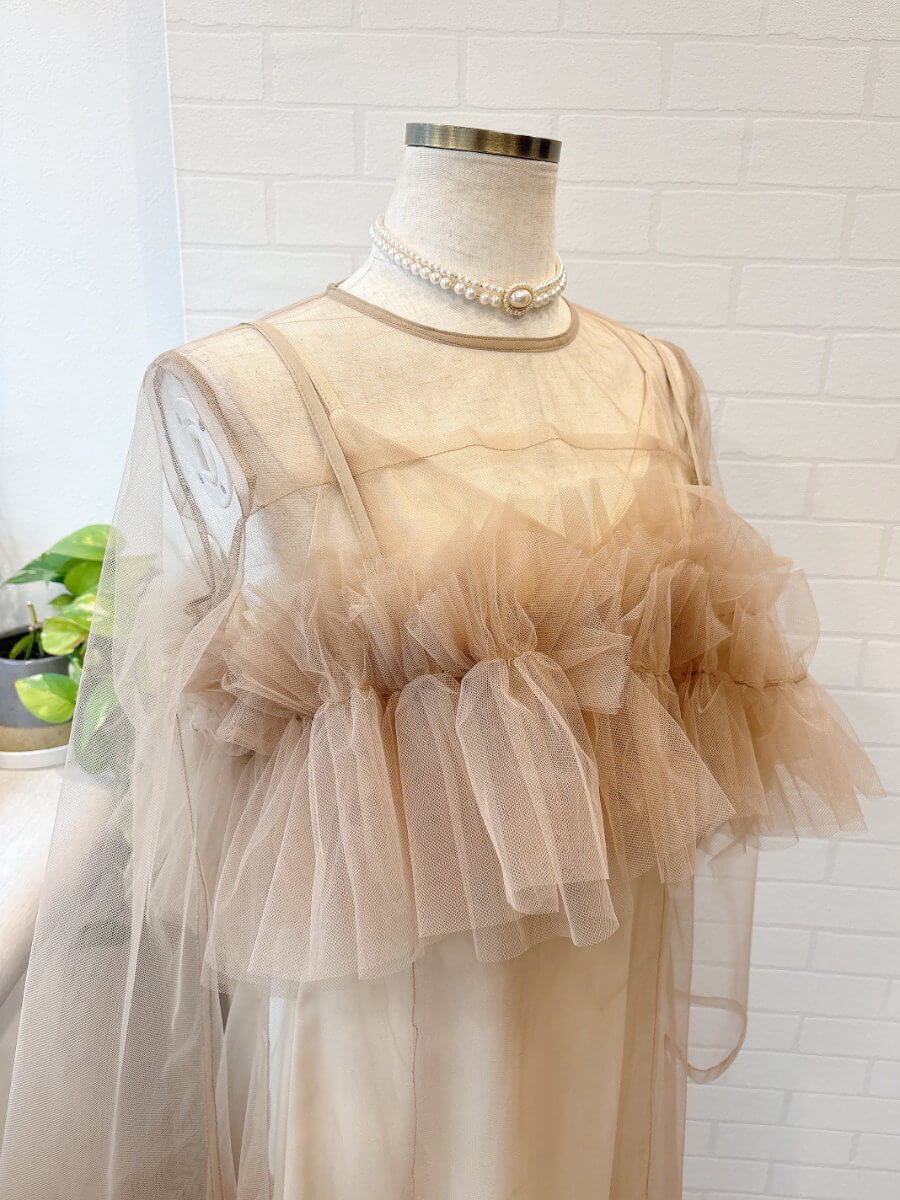 たっぷりのチュールを贅沢に使ったギャザービスチェ、シアードレス、シンプルなインナーワンピースを重ねたレイヤードドレス。