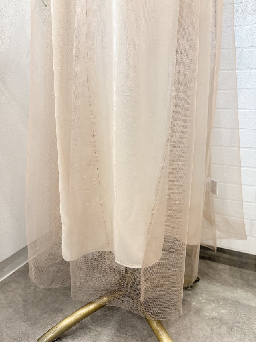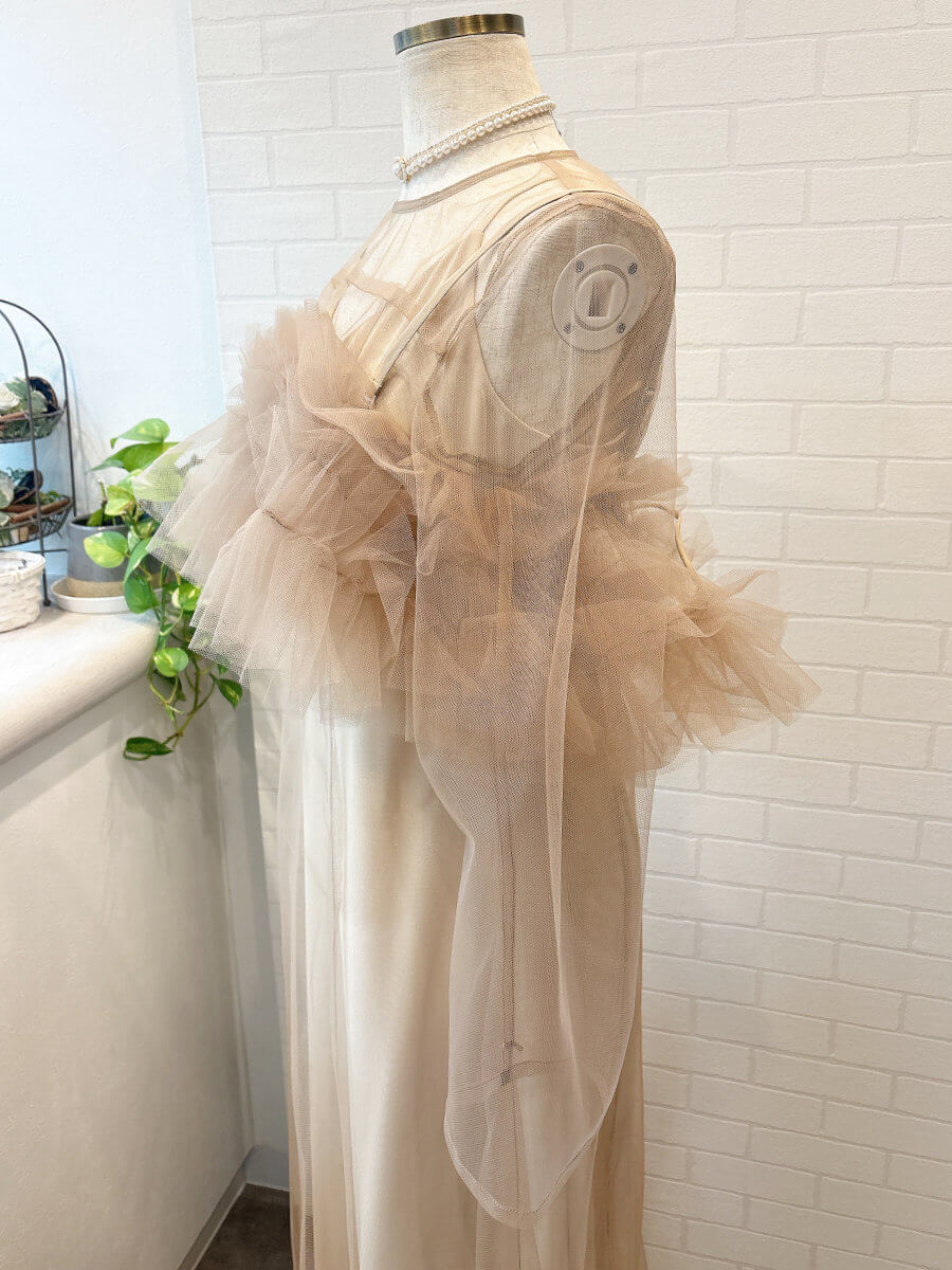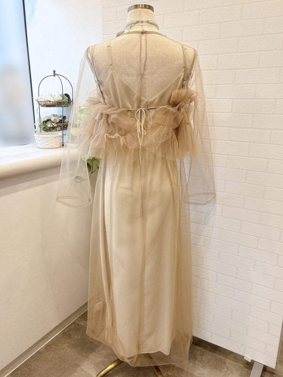 たっぷりのチュールを贅沢に使ったギャザービスチェ、シアードレス、シンプルなインナーワンピースを重ねたレイヤードドレス。