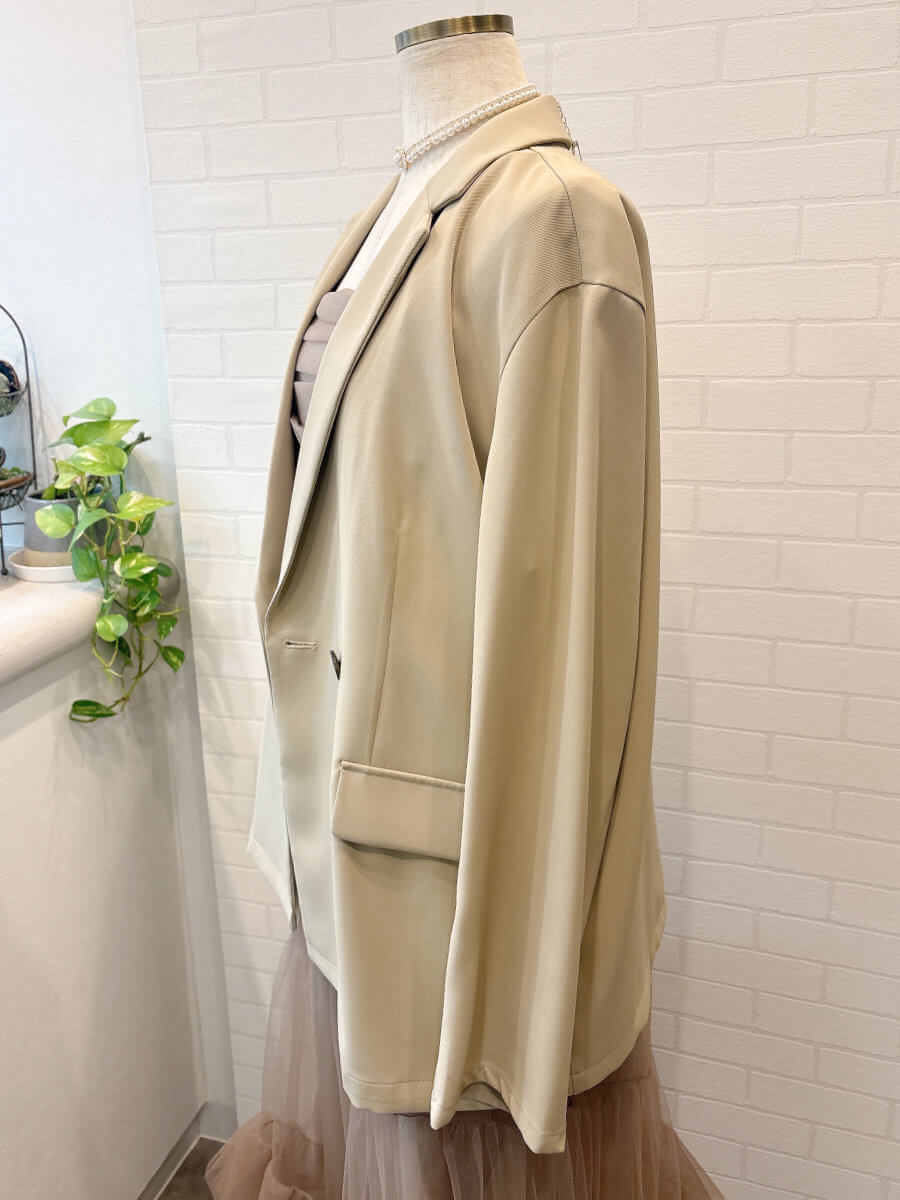 ジャケットは軽めのお素材でオーバーサイズ。ゆるっと今っぽく着こなせます。裏地はなくさらっと着れるので真夏以外は着用できます。ジャケットのポケットはフェイクです。