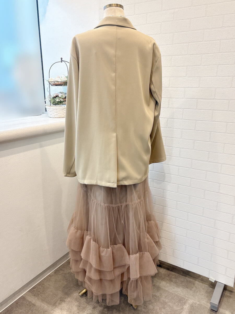 ◇商品について:裾にたっぷりフリルをあしらったチュール素材のキャミワンピースと、ジャケットを組み合わせたセットアイテム。チュールワンピースはハイウエストデザインでゆったりシルエット。マタニティ初期の方も着用できます。程よく張り感のあるチュールワンピースはトップスを変えて華やかに着こなすこともできます。