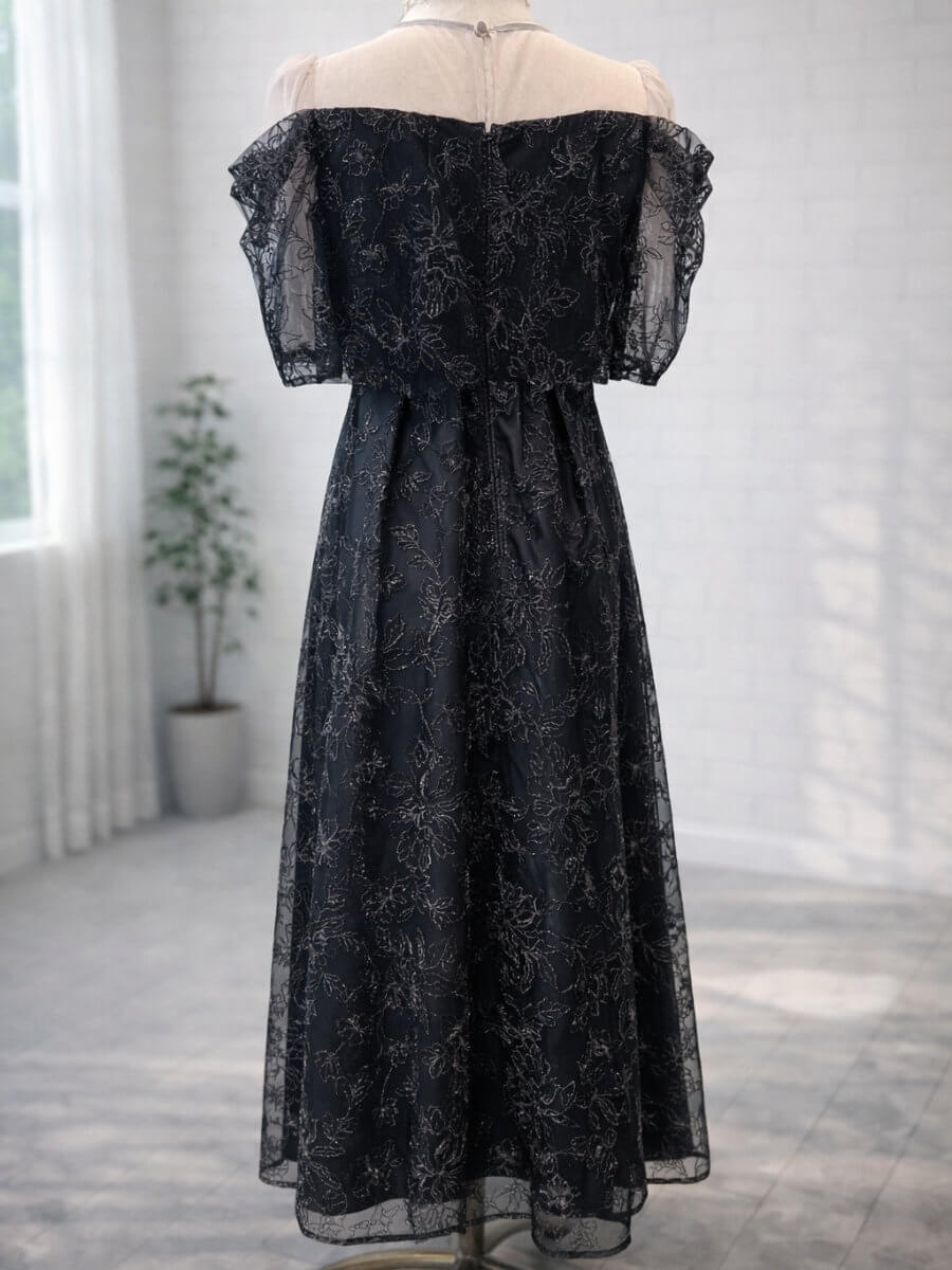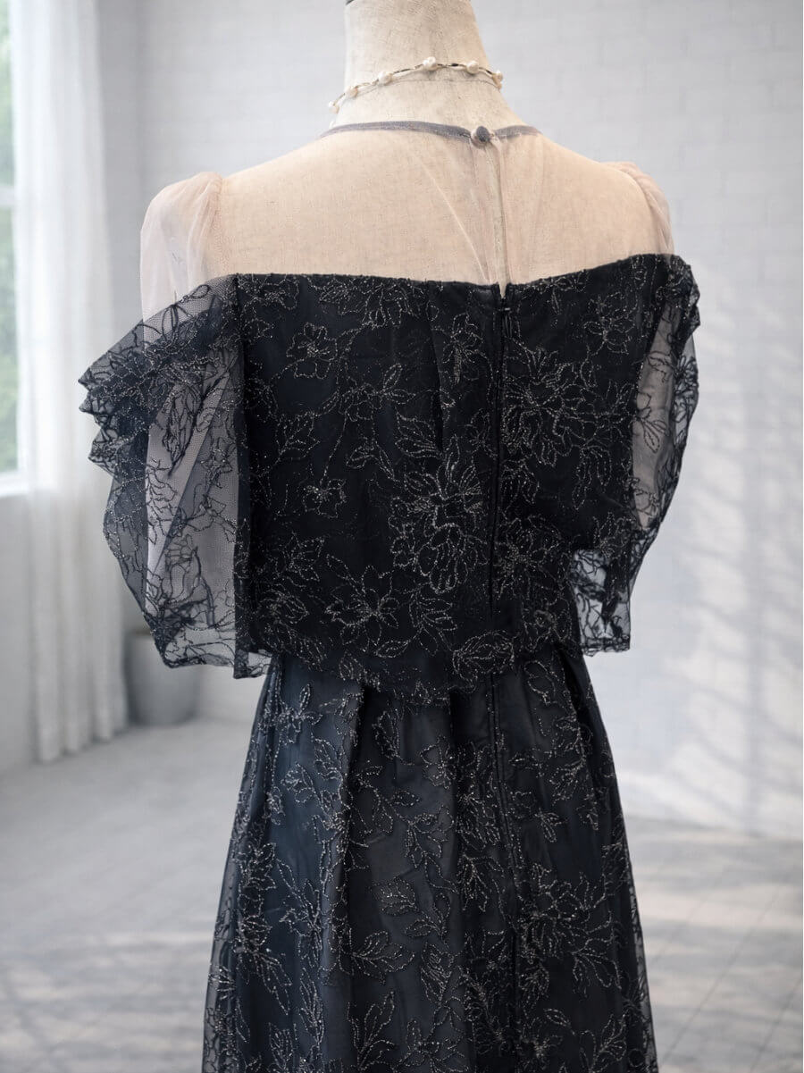 ◇商品について:ラメ糸を織り込んだ華やかな刺繍レースが輝きのあるドレスです。程よい透け感のシアーでデコルテをデザイン。オフショル風のタック入りスリーブで女性らしいドレスです。デコルテのシアー部分はベージュ系のお色味で首回りはグレーの縁取りが裏側に縫い付けされています。刺繍はラメ糸で華やかさがプラスされています。上品な華やかさがあるので結婚式だけでなくパーティや謝恩会にもおすすめです。