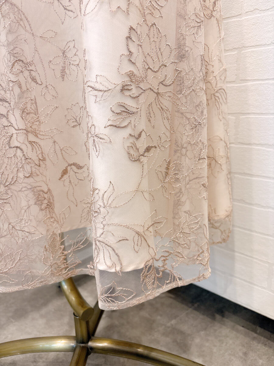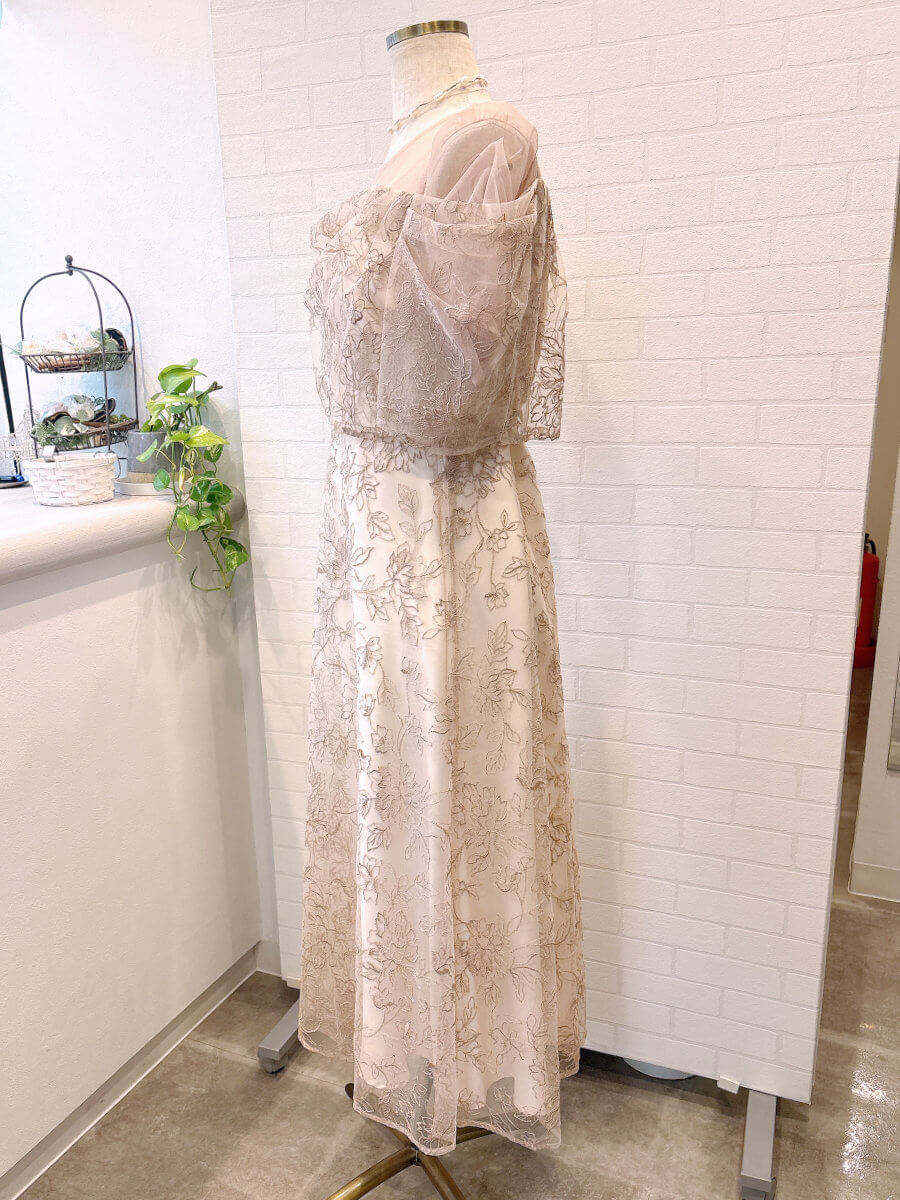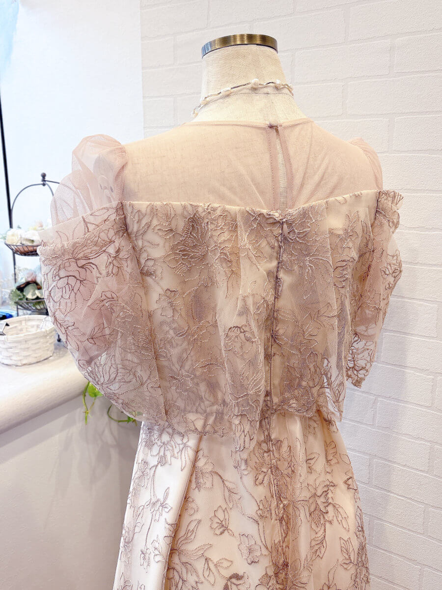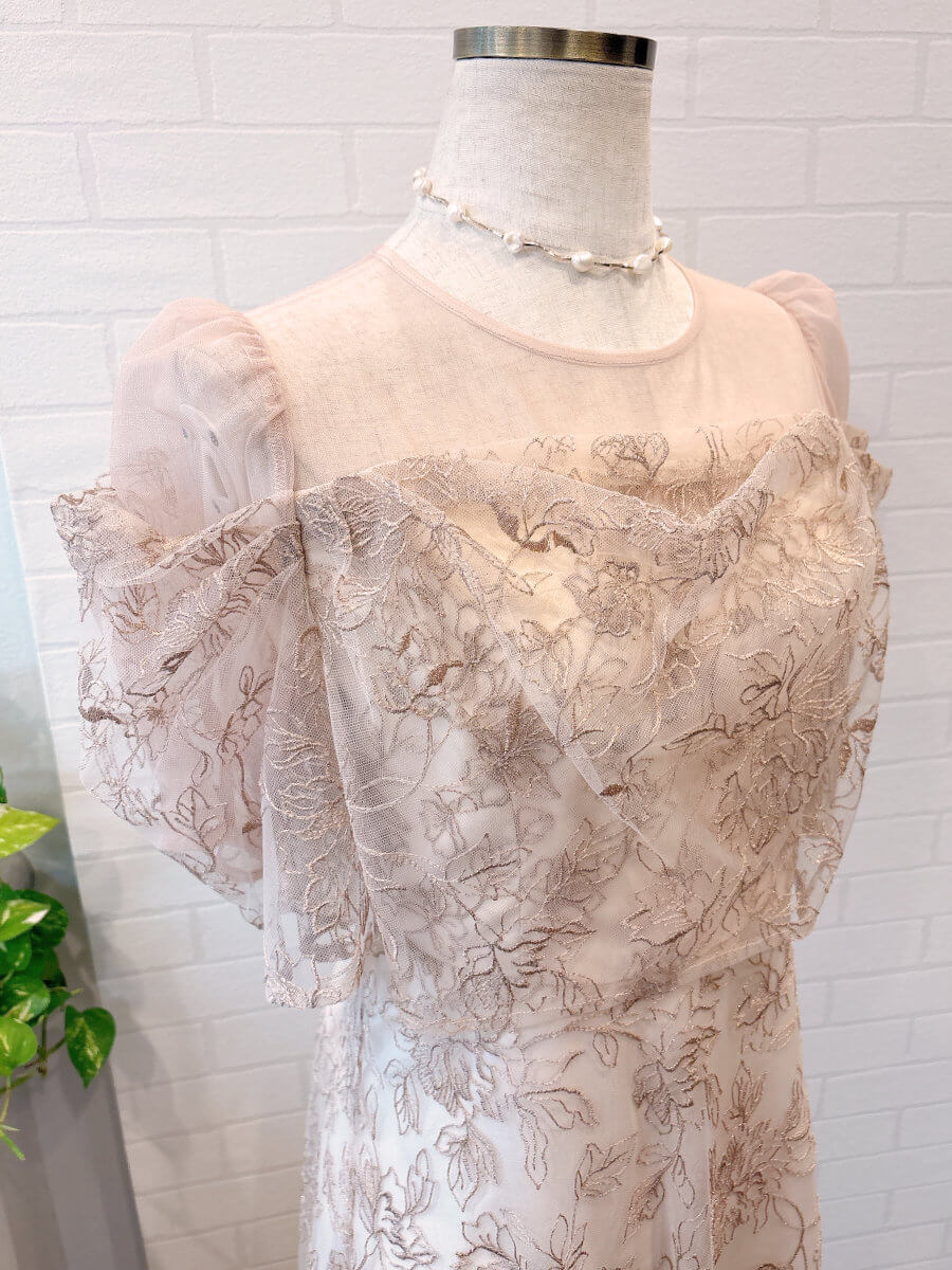◇商品について:ラメ糸を織り込んだ華やかな刺繍レースが輝きのあるドレスです。程よい透け感のシアーでデコルテをデザイン。オフショル風のタック入りスリーブで女性らしいドレスです。