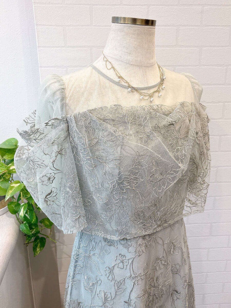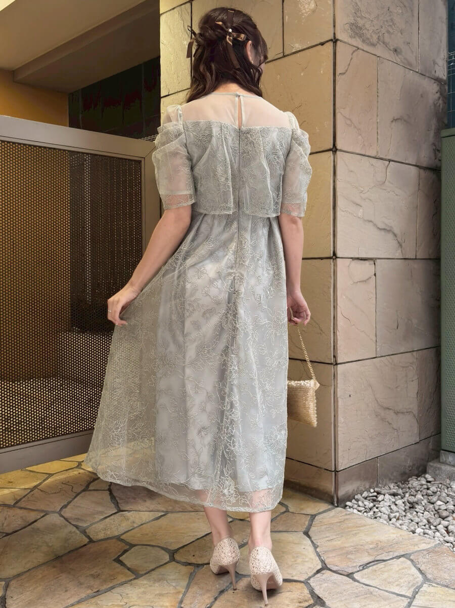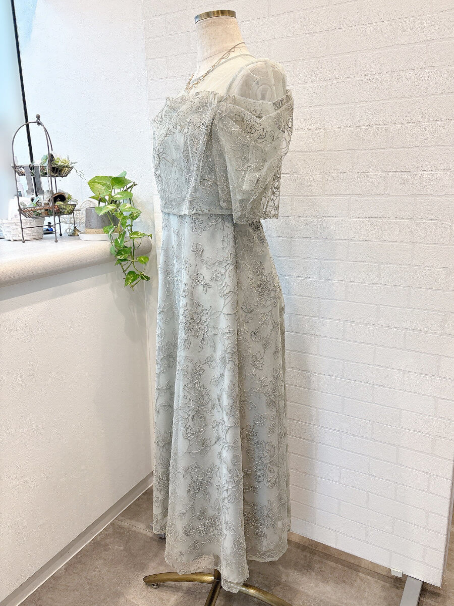 ◇商品について:ラメ糸を織り込んだ華やかな刺繍レースが輝きのあるドレスです。程よい透け感のシアーでデコルテをデザイン。オフショル風のタック入りスリーブで女性らしいドレスです。