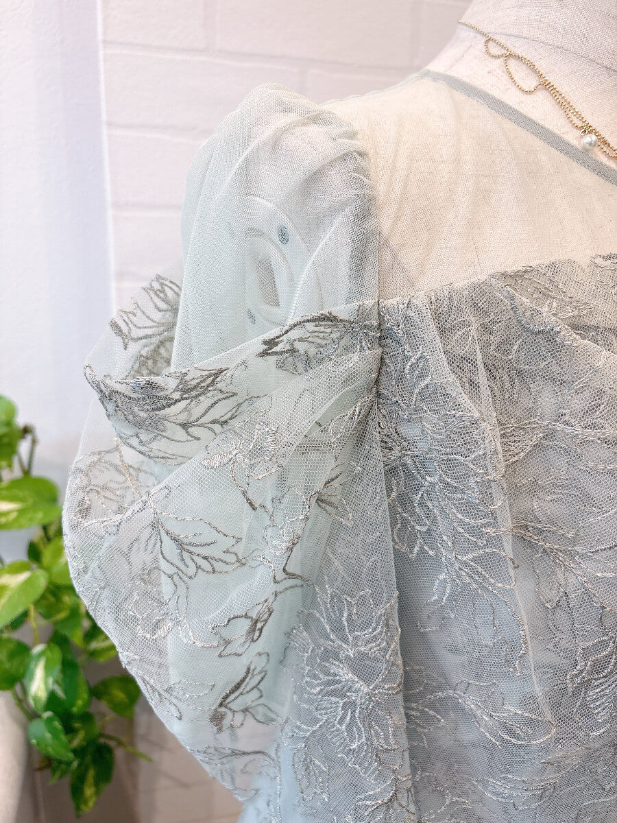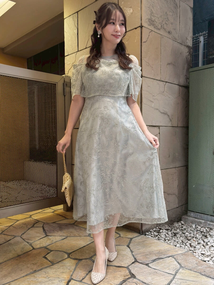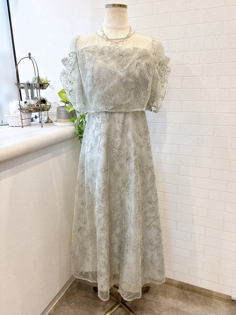 ◇商品について:ラメ糸を織り込んだ華やかな刺繍レースが輝きのあるドレスです。程よい透け感のシアーでデコルテをデザイン。オフショル風のタック入りスリーブで女性らしいドレスです。
