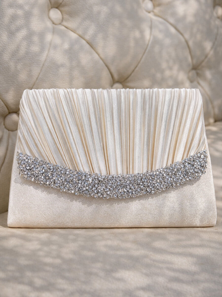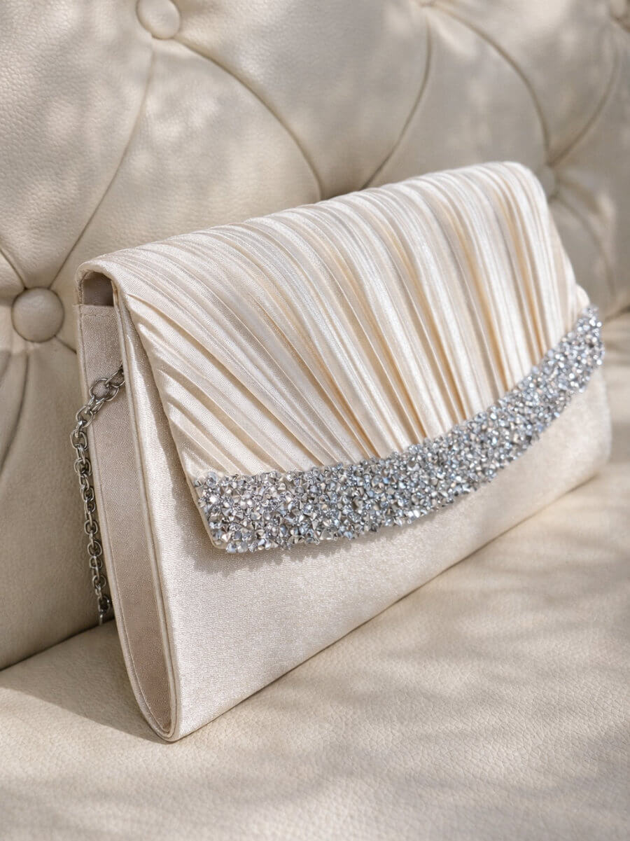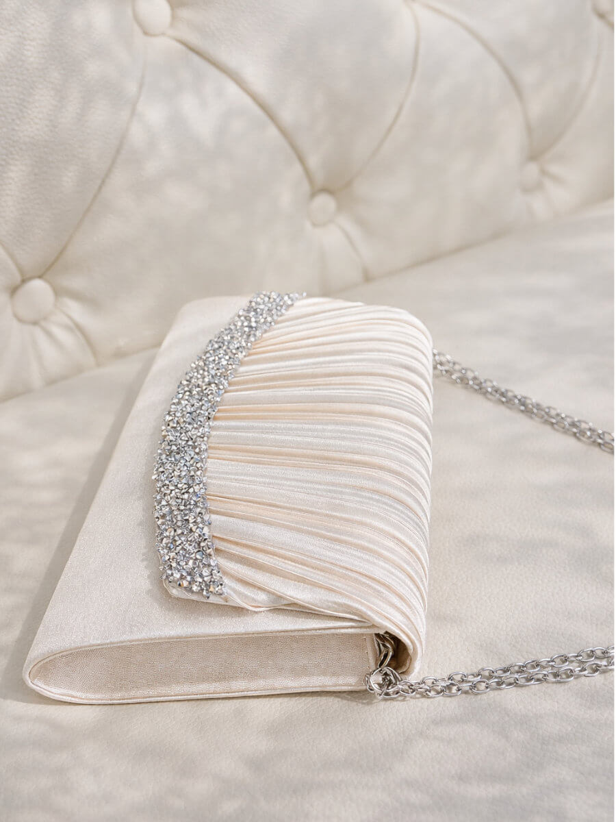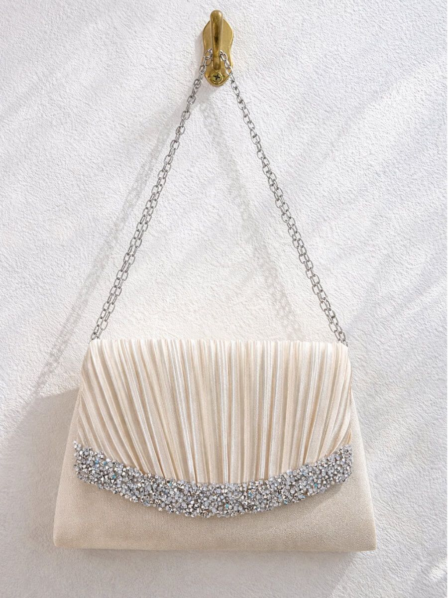 ◇カラー:ベージュ ◇大きさ:底辺21cm 高さ14cm ◇商品について:ベージュにシルバーのビジューが華やかなデザインです。小ぶりでかわいらしく上品な印象に。