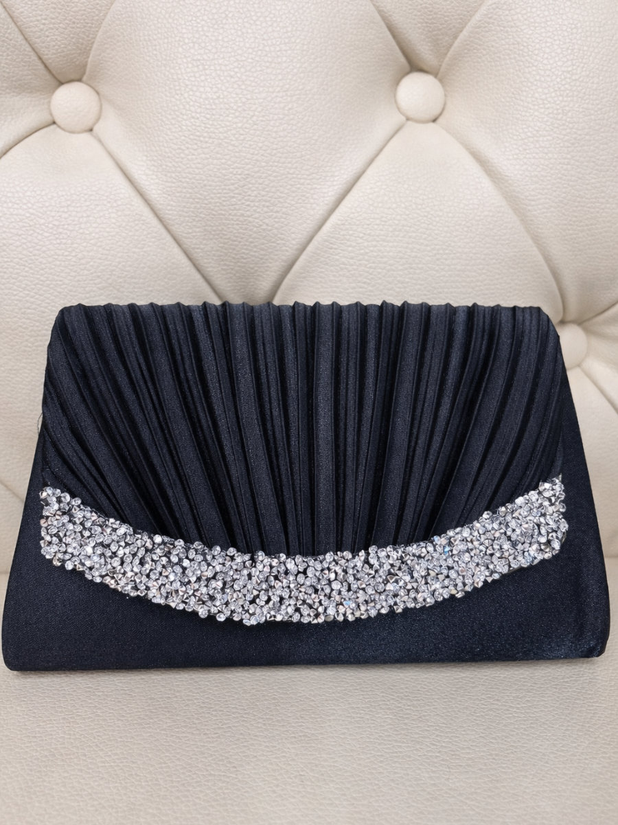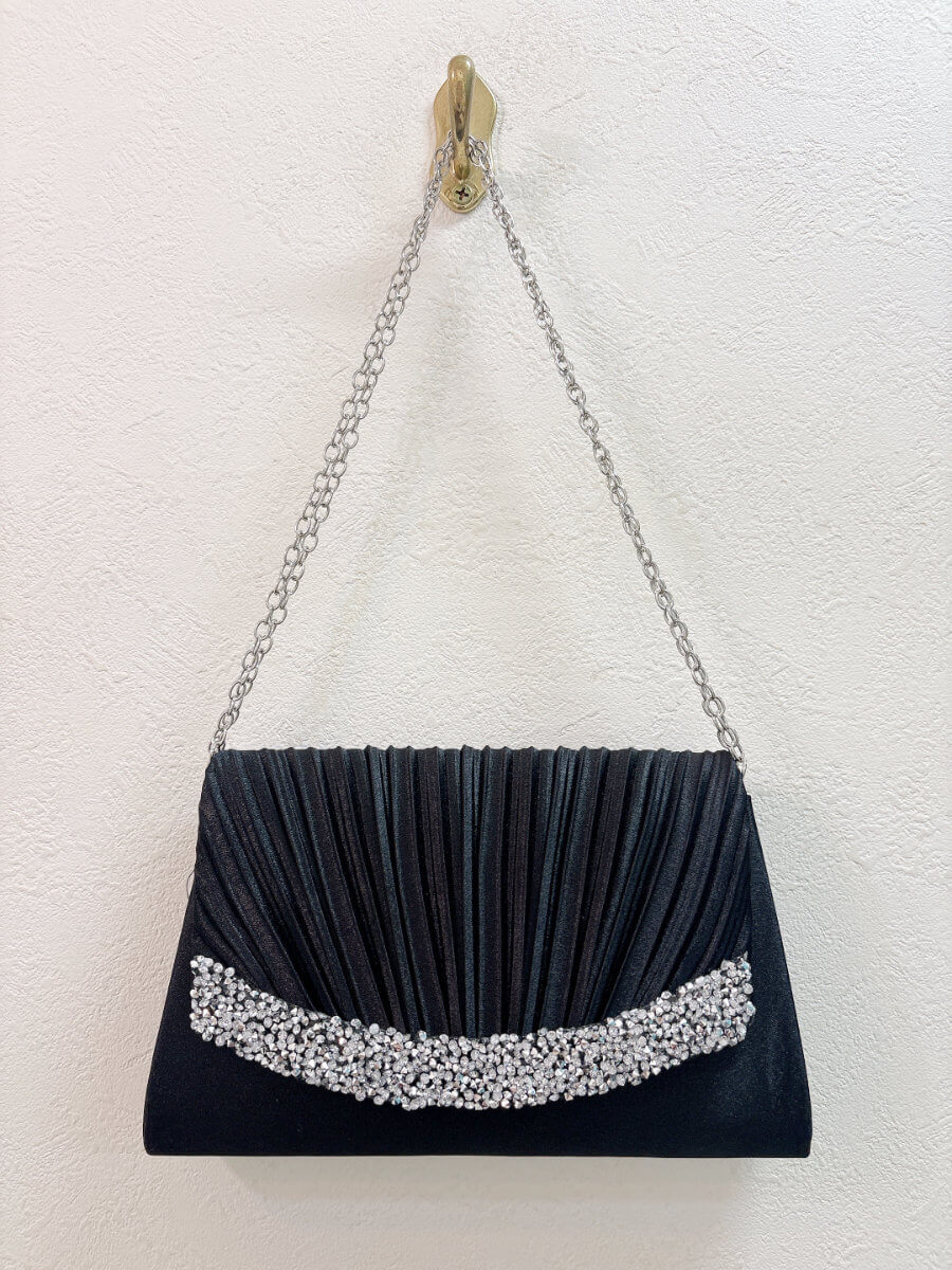 ◇カラー:ブラック ◇大きさ:底辺21cm 高さ14cm ◇商品について:ブラックにシルバーのビジューが華やかなデザインです。小ぶりでかわいらしく上品な印象に。
