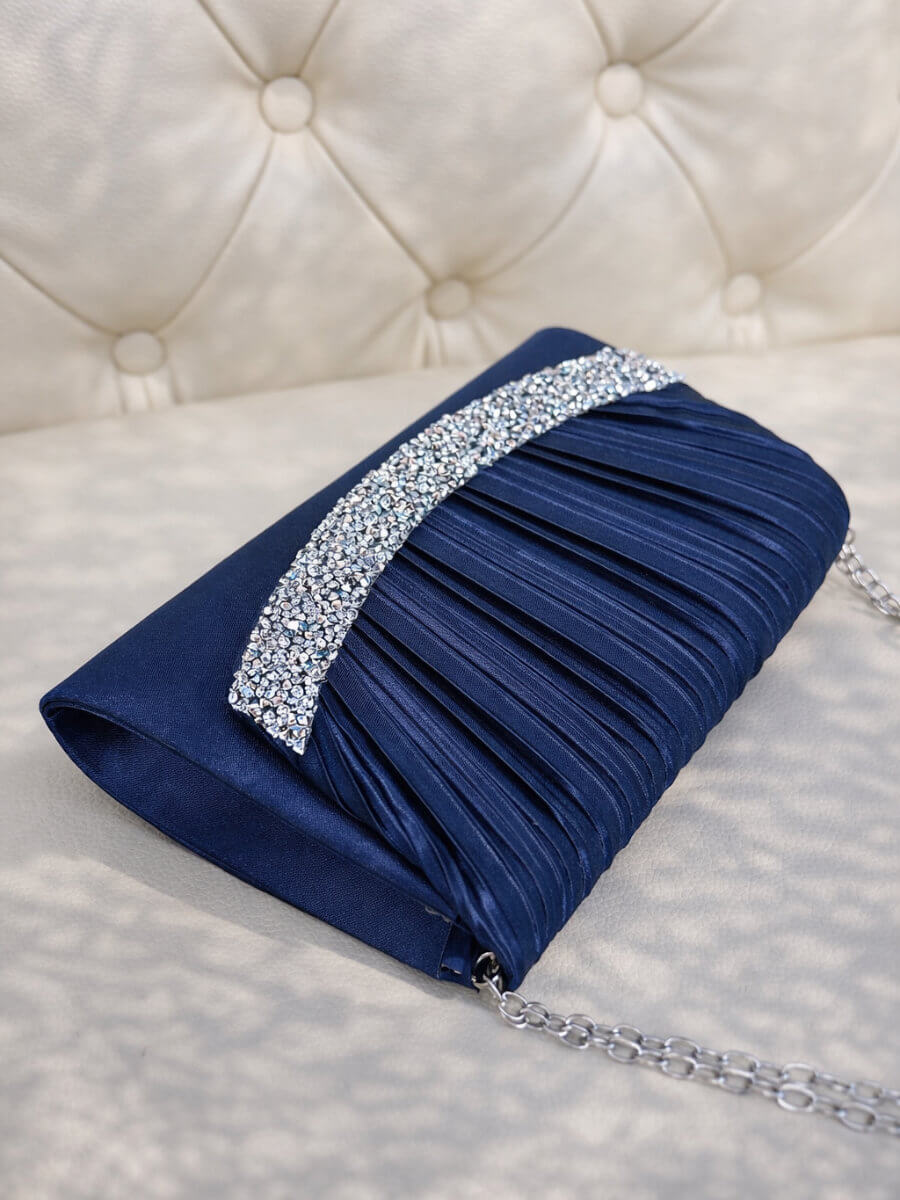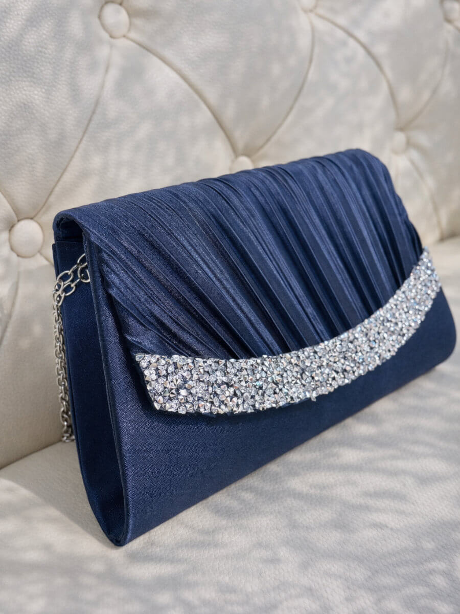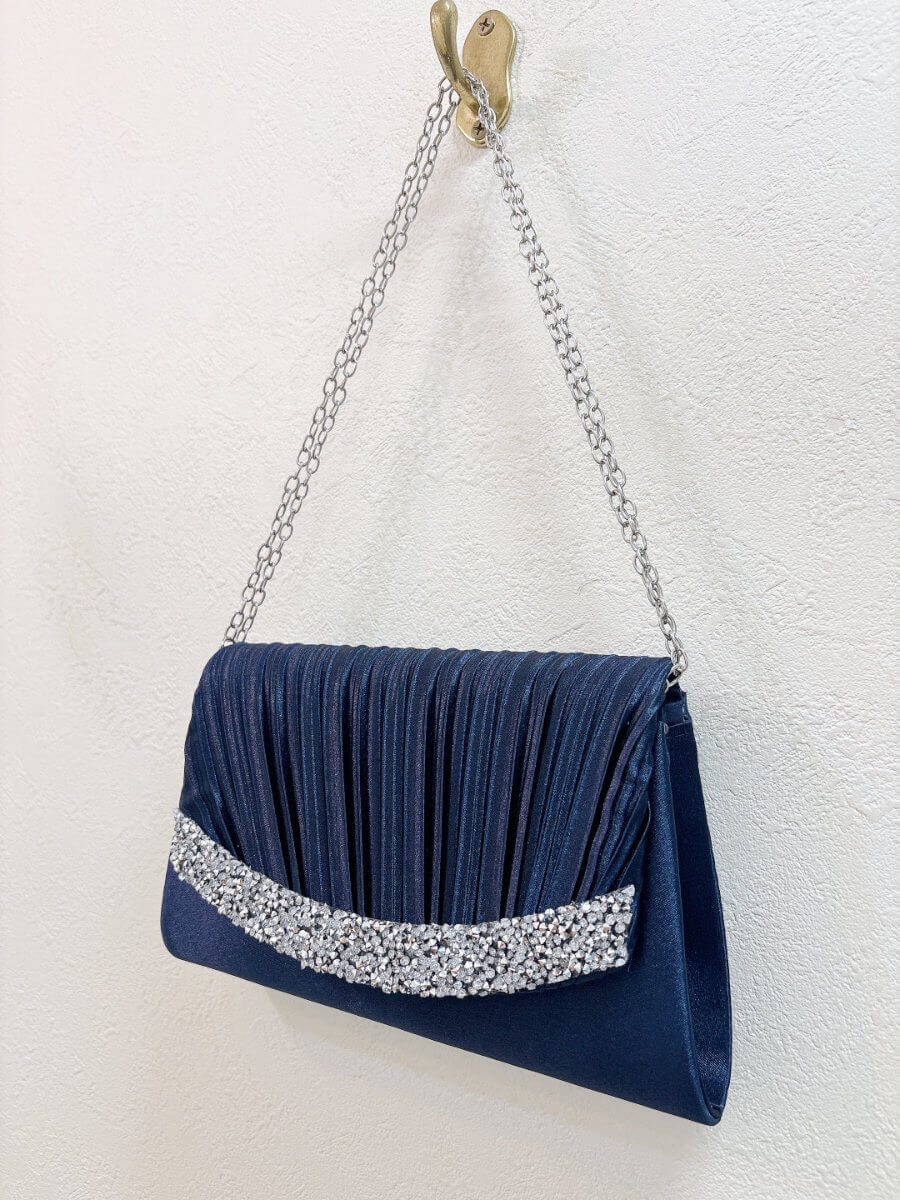 ◇カラー:ネイビー ◇大きさ:底辺21cm 高さ14cm ◇商品について:ネイビーにシルバーのビジューが華やかなデザインです。小ぶりでかわいらしく上品な印象に。