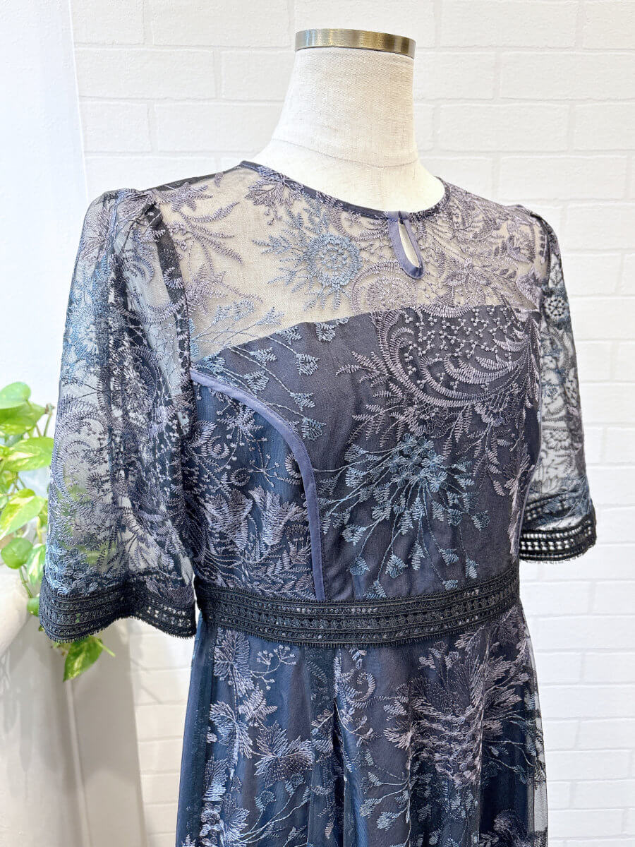 露出を抑えたデザインで着用しやすいドレスです。レーススリーブは肘丈で二の腕などの気になる部分をカバー。