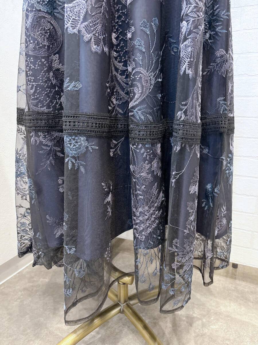 デコルテ、スカート裾部分はさりげなく透けるので程よい抜け感のあるスタイルに。