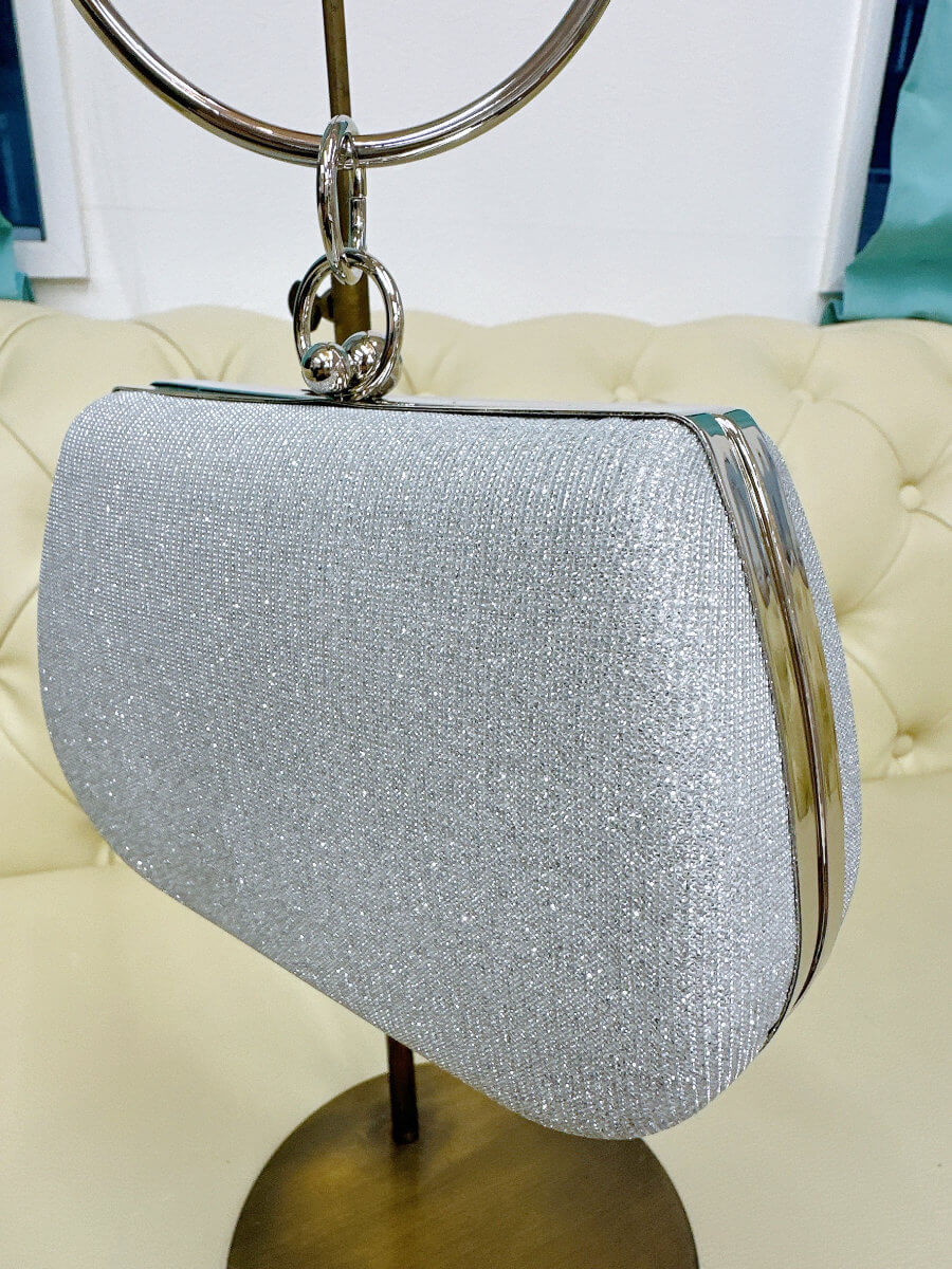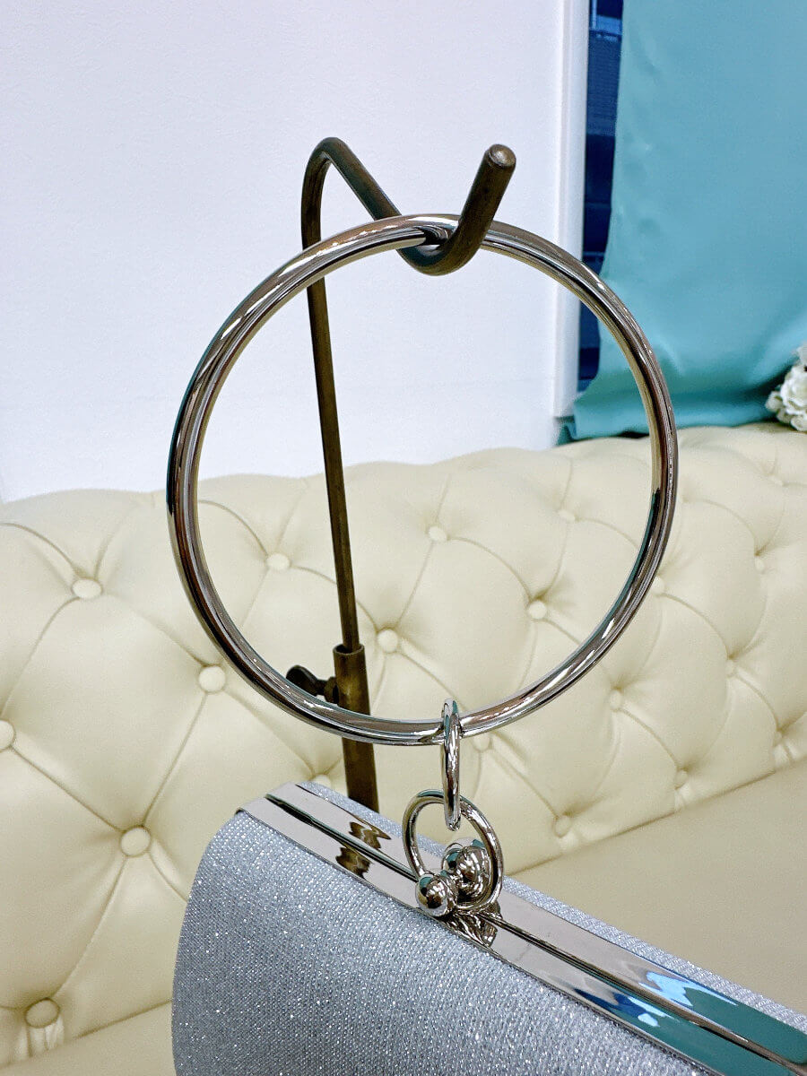 ◇商品について:シルバーの細かいラメでバッグがほどよく輝きます。リングタイプの持ち手がおしゃれでファッションのポイントになります。ハードタイプのバッグなので形崩れせずご利用頂けます。留め具部分は大小のシルバーボールになっていて開ける際は小さい方を大きい方に向けて推して開けてください。