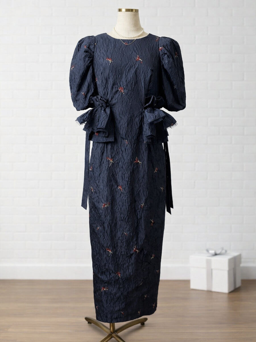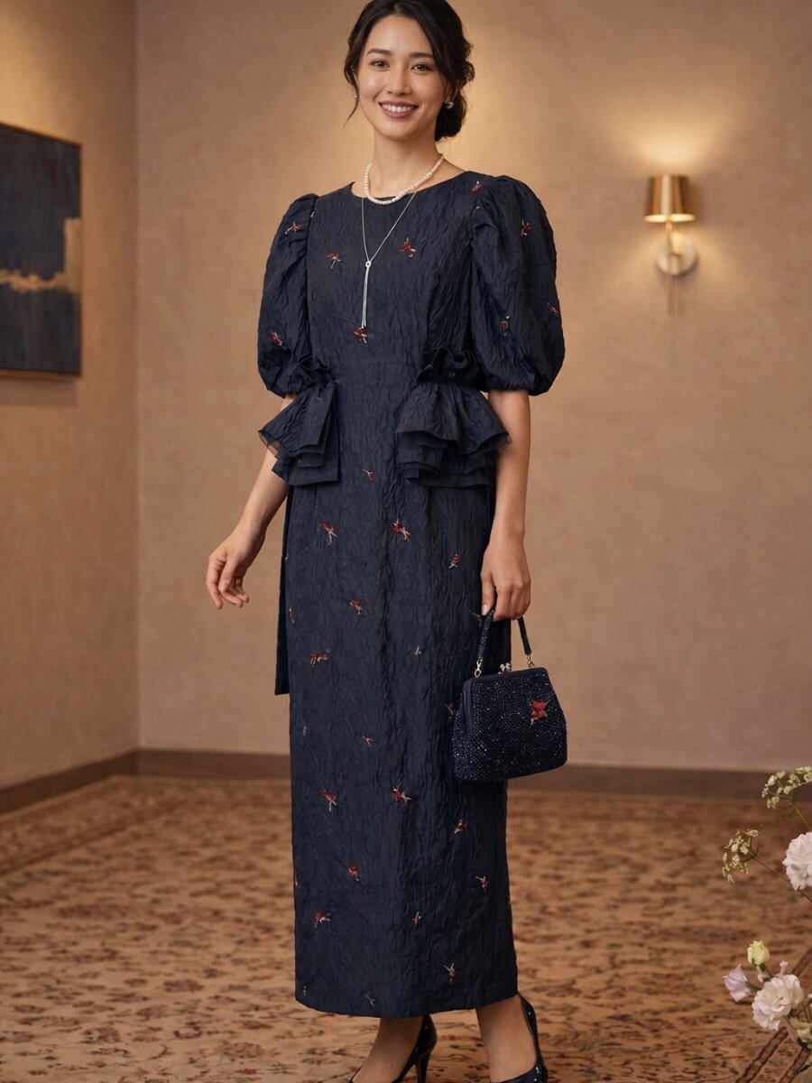 ふんわりとした袖が二の腕をカバーしつつ、クラシカルで女性らしいシルエットを演出します。