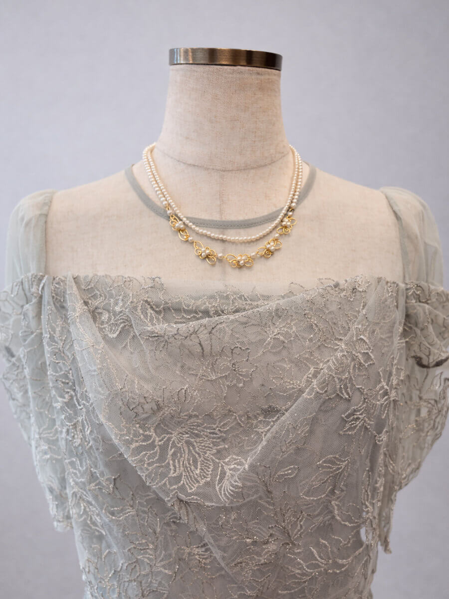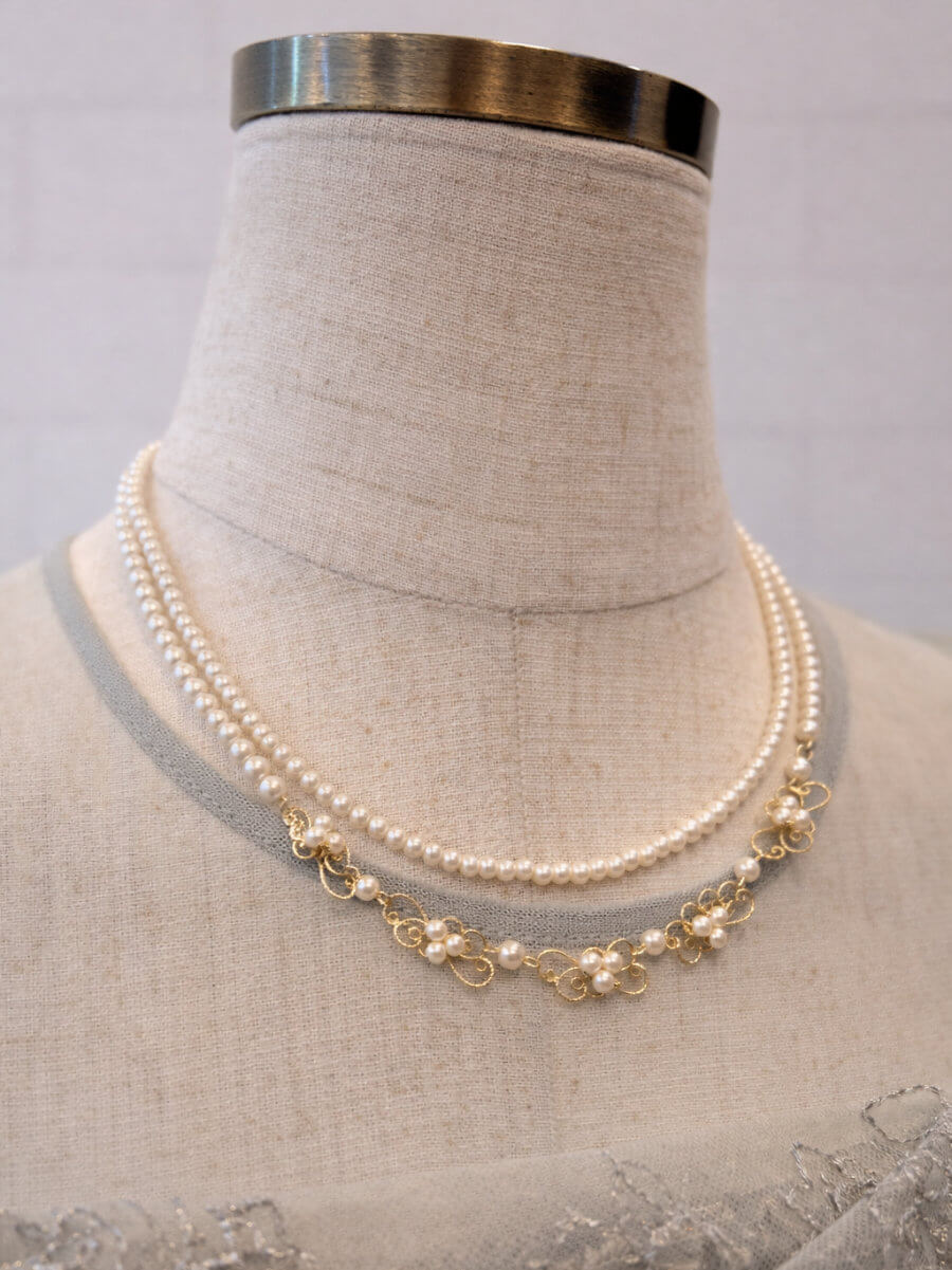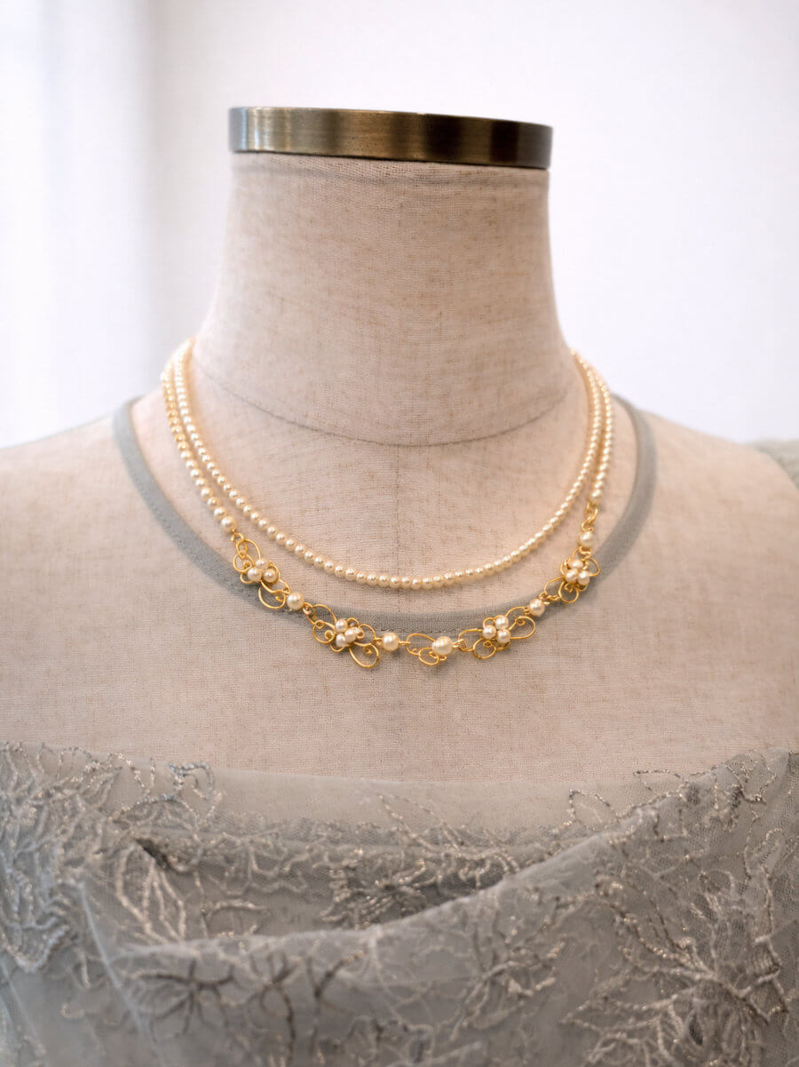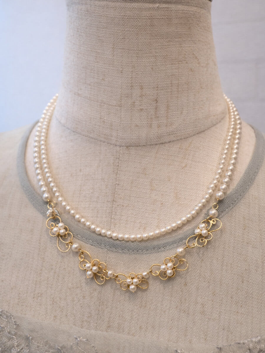 小粒の二連パールにデザインが施されたネックレスです。 華奢でなんにでも合わせやすいです。
