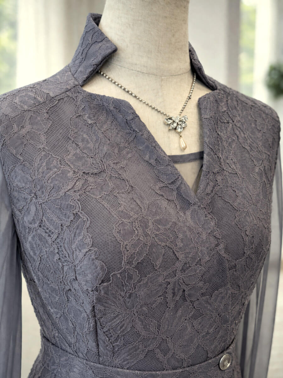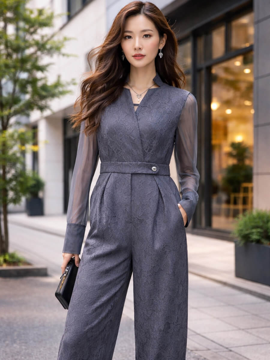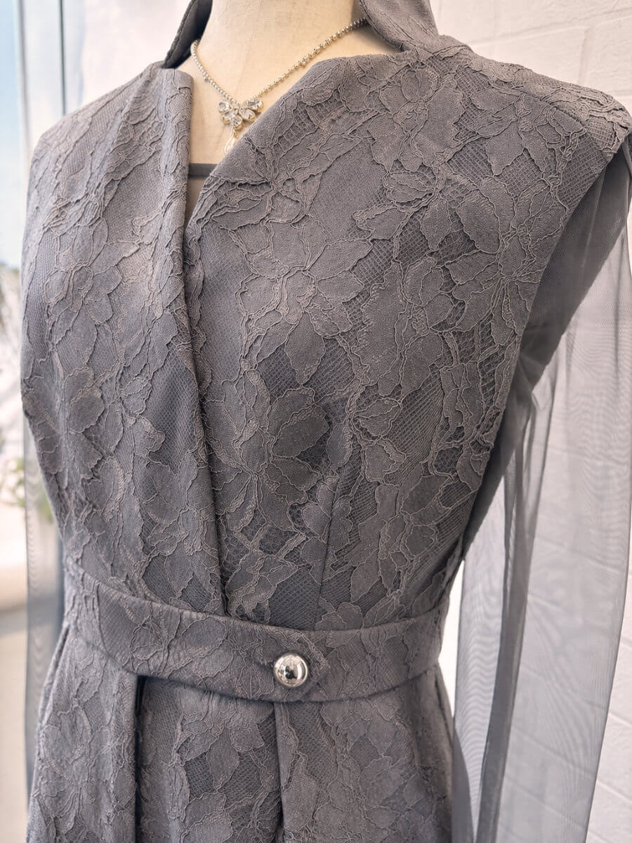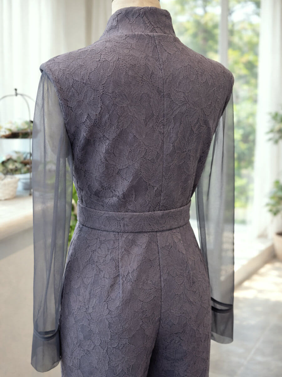 ◇商品について:グレーシアーのインナーとオールインワンパンツのセットアップです。前ボタンとチャックにすることでオールインワンパンツドレスの脱着問題を解決。ボンディング加工を施した張りのあるレースで高級感のある仕上がりになっています。個性的なネックラインと抜け感がクールでモードな印象に。うれしいポケット付きのパンツで、スマホなどとりあえず今しまいたいものなどがスルッと収納できます。