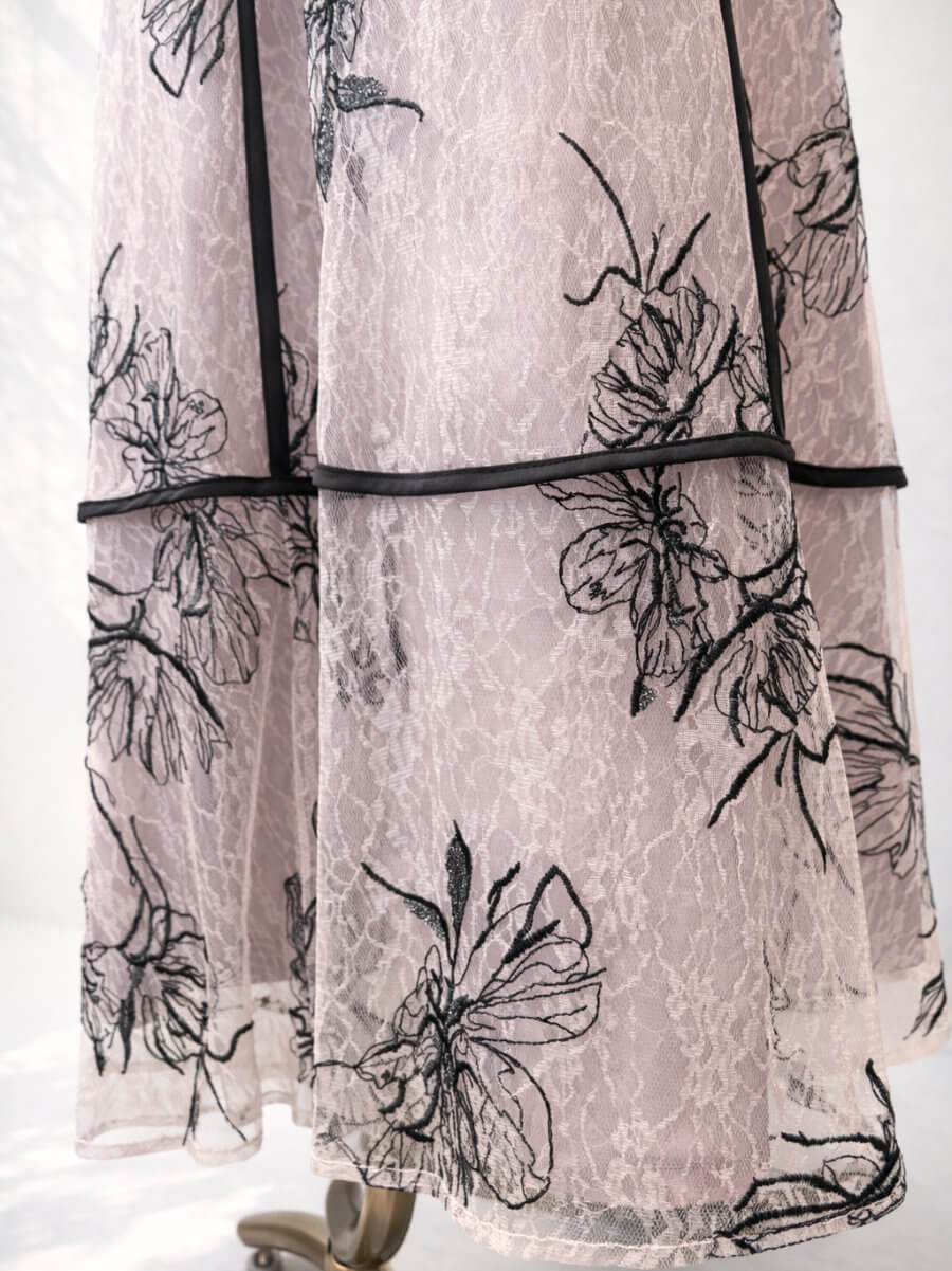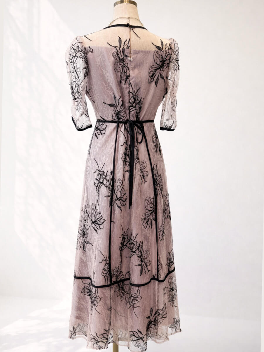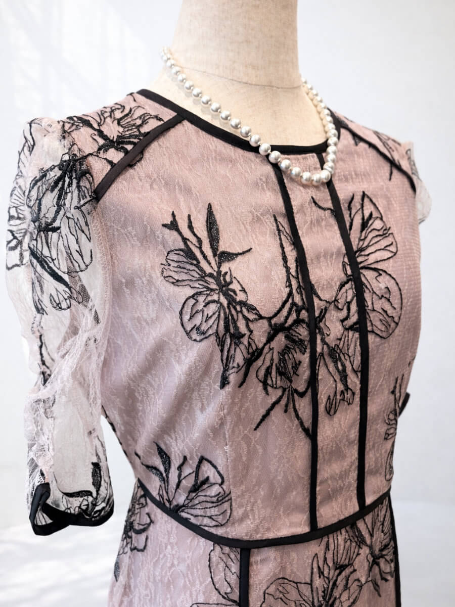 ◇商品について:サテン生地のインナーにピンクのレースがレイヤード。刺繍にはブラックとシルバーのラメ糸が施されており程よく輝きを放ちます。ウエスト部分はリボンで調整が可能です。繊細なレースで上品さがあります。スカートの裾部分はフレアになっていてふわりと揺れるドレスです。カシュクールの袖で二の腕をうまくカバーされます。フロント部分のデコルテに透け感はありませんが後ろの方部分はレースで透け感がありますので下着にはお気を付けください。
