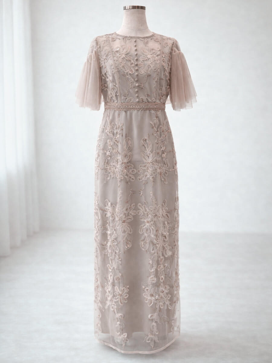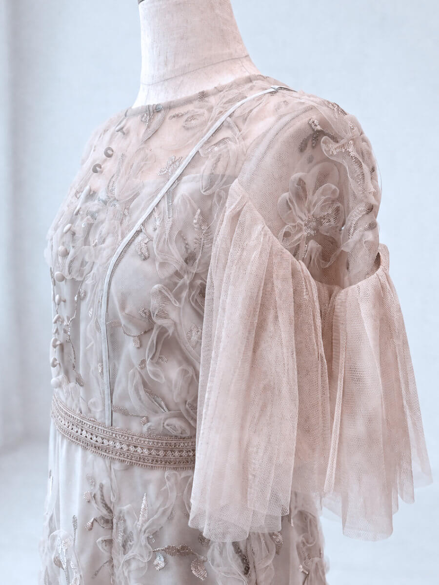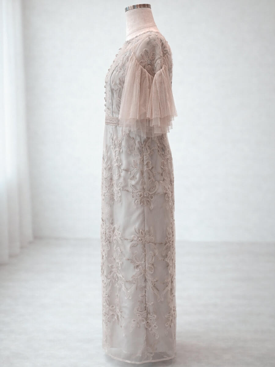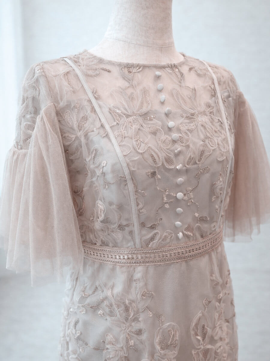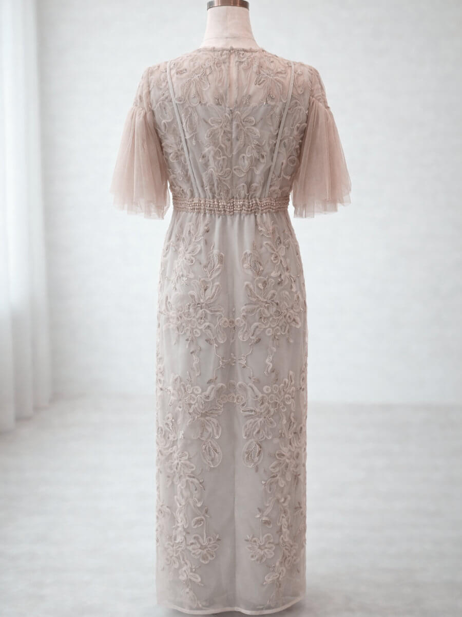 繊細なフラワー刺繍と立体感のあるレースが全体にあしらわれています。ドレスカラーと同じスパンコールが動く度に輝きます。ほんのり透け感のあるチュールスリーブは気になる二の腕をカバーし軽やかな印象に。うれしいポケット付きです。ウエスト部分の切り返しなどメリハリは忘れず柔らかさのあるシルエット。くるみボタンひとつひとつにも生地をレイヤードしており、こだわりの一着です。落ち着いたニュアンスカラーで結婚式だけでなく、成人式パーティ、謝恩会、女子会、お食事会など幅広いシーンでご着用頂けます。
