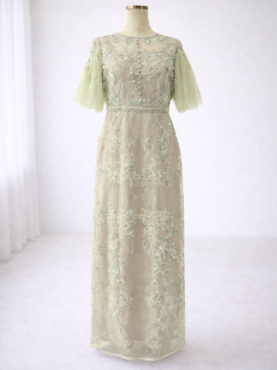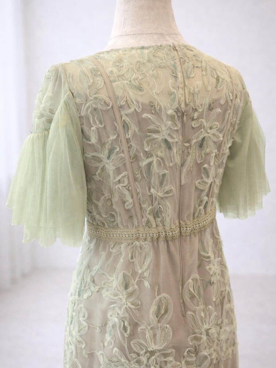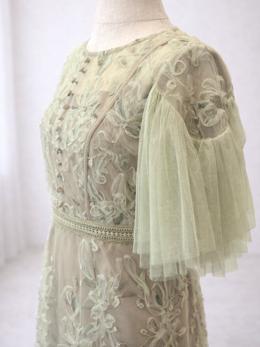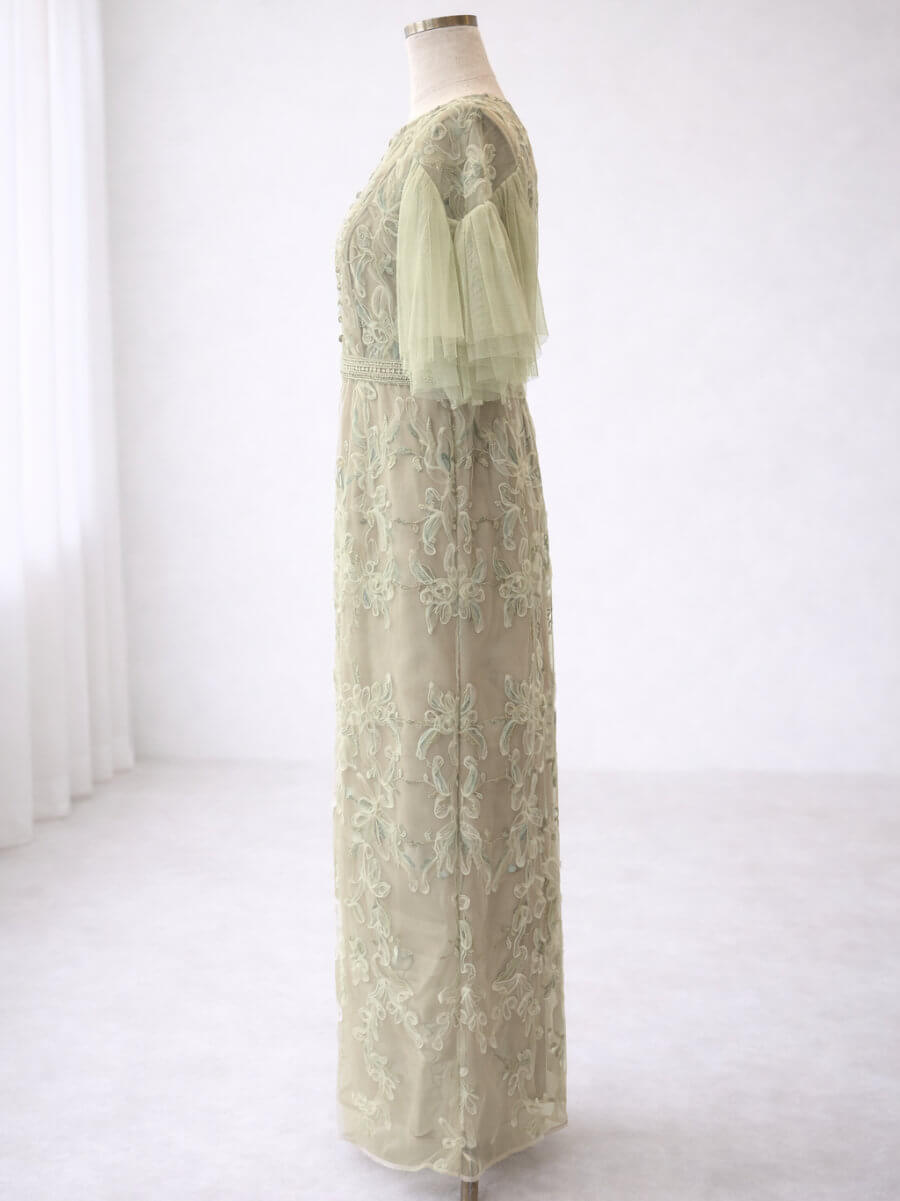 繊細なフラワー刺繍と立体感のあるレースが全体にあしらわれています。ドレスカラーと同じスパンコールが動く度に輝きます。ほんのり透け感のあるチュールスリーブは気になる二の腕をカバーし軽やかな印象に。うれしいポケット付きです。ウエスト部分の切り返しなどメリハリは忘れず柔らかさのあるシルエット。くるみボタンひとつひとつにも生地をレイヤードしており、こだわりの一着です。落ち着いたニュアンスカラーで結婚式だけでなく、成人式パーティ、謝恩会、女子会、お食事会など幅広いシーンでご着用頂けます。