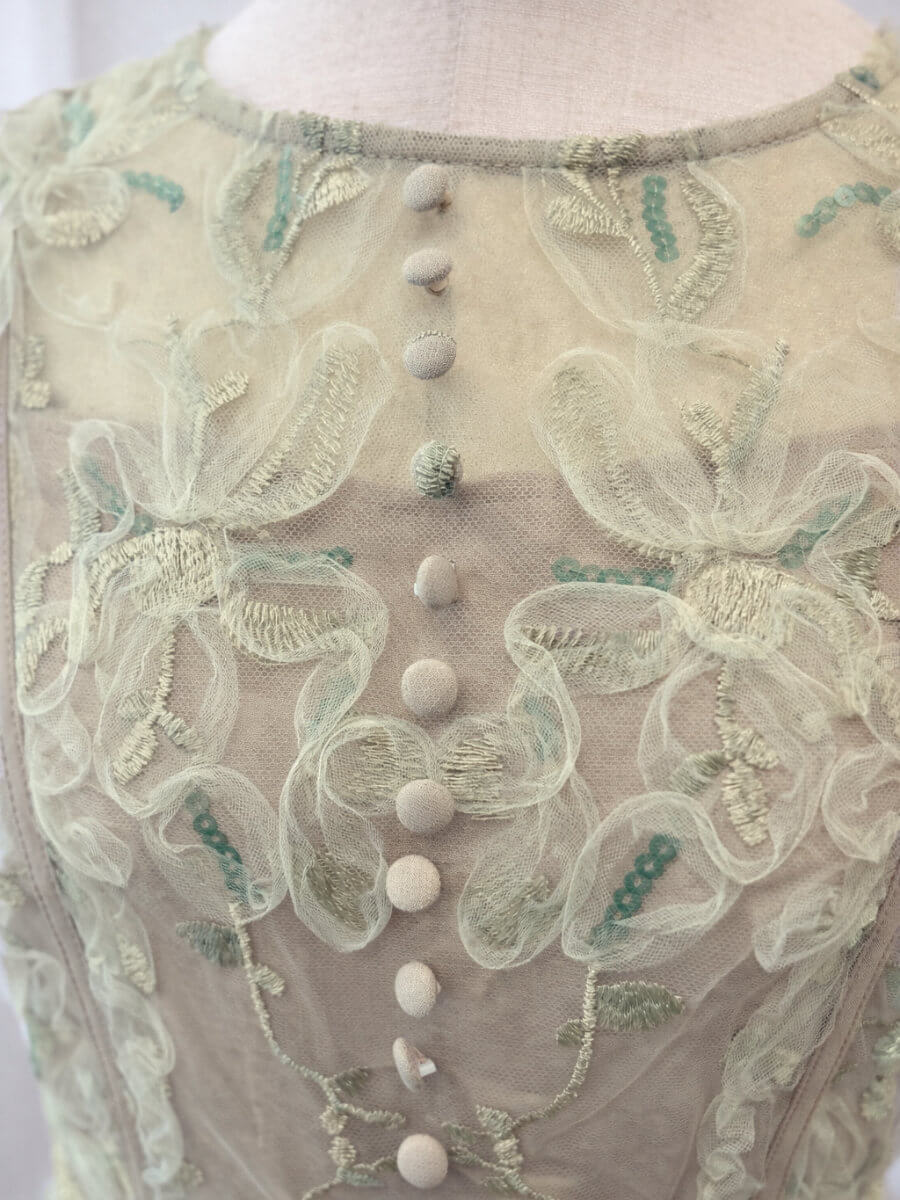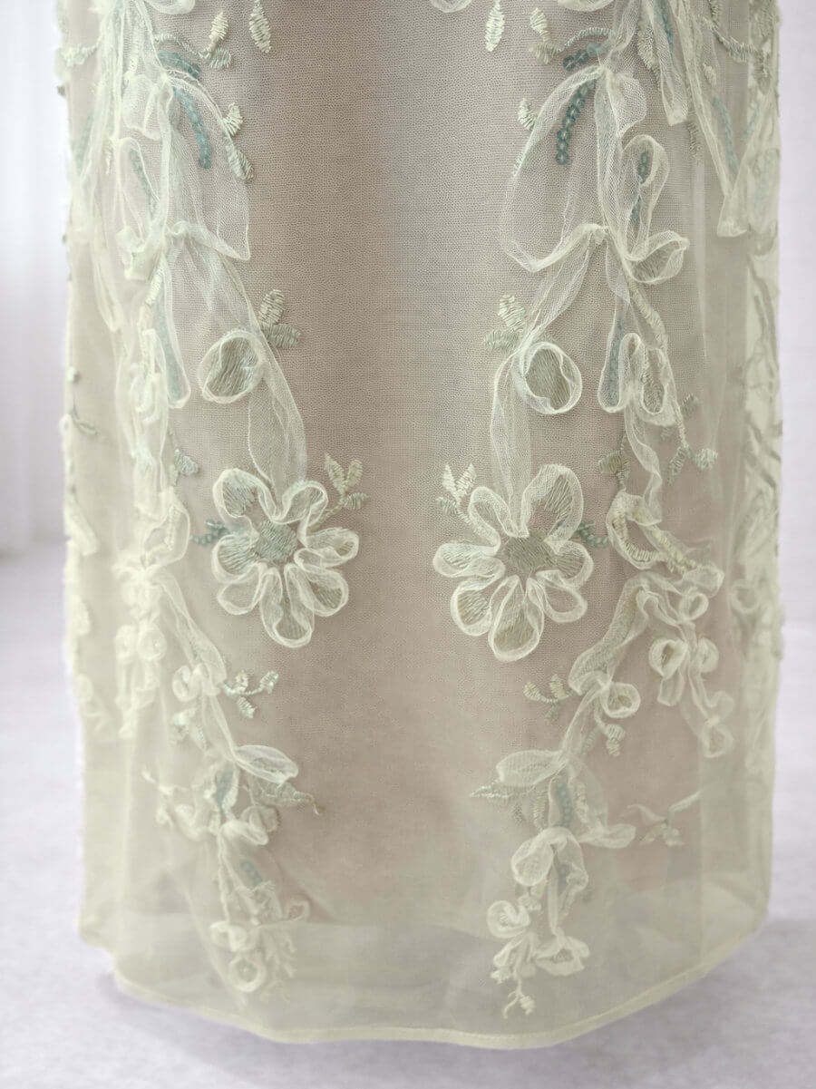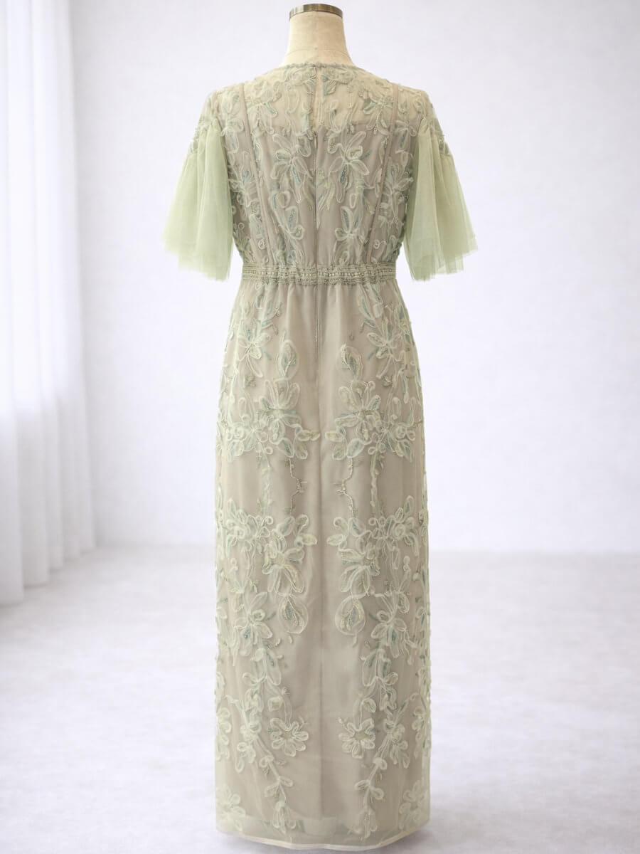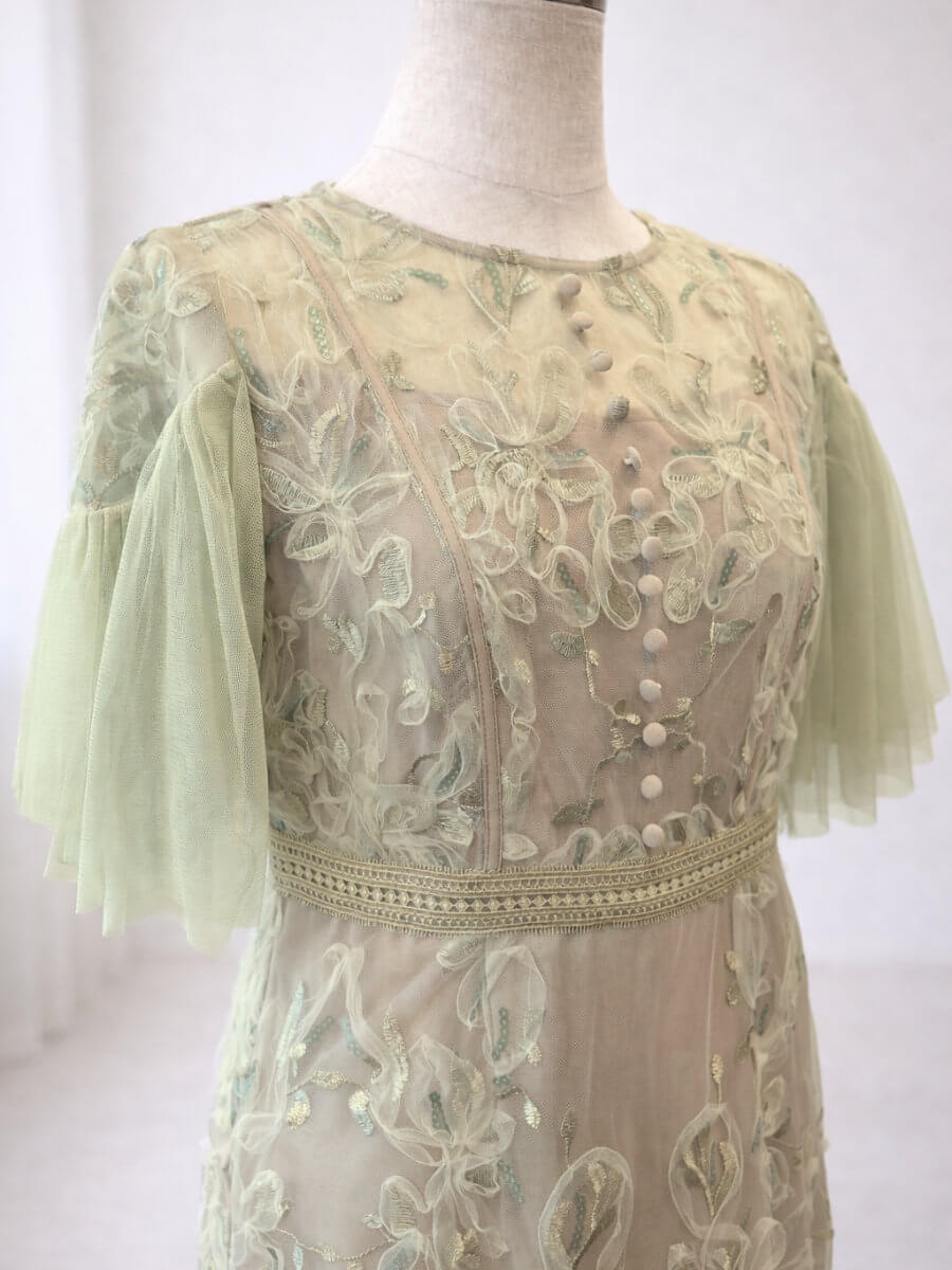 繊細なフラワー刺繍と立体感のあるレースが全体にあしらわれています。ドレスカラーと同じスパンコールが動く度に輝きます。ほんのり透け感のあるチュールスリーブは気になる二の腕をカバーし軽やかな印象に。うれしいポケット付きです。ウエスト部分の切り返しなどメリハリは忘れず柔らかさのあるシルエット。くるみボタンひとつひとつにも生地をレイヤードしており、こだわりの一着です。落ち着いたニュアンスカラーで結婚式だけでなく、成人式パーティ、謝恩会、女子会、お食事会など幅広いシーンでご着用頂けます。