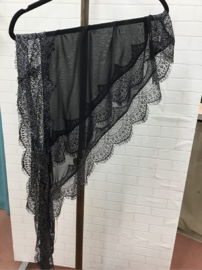 ポンチョ風のショールで端にラメレースが施してあり華やかさを演出します。透け感のあるブラックなので重くなりすぎません。